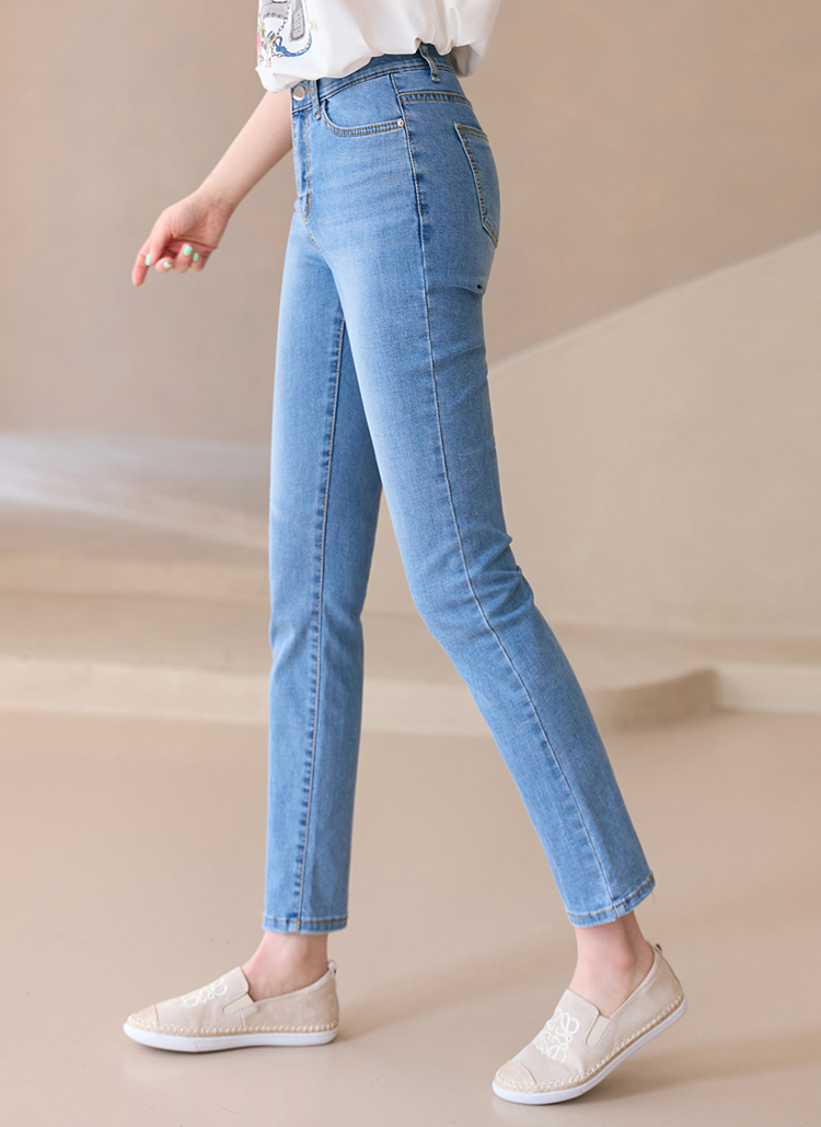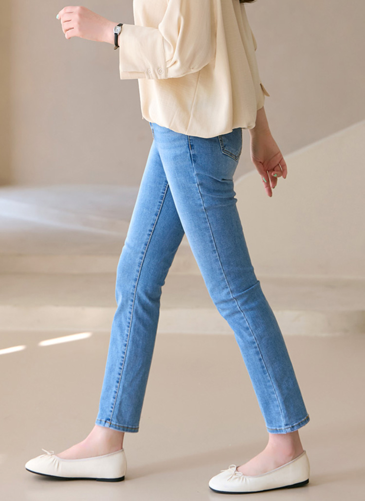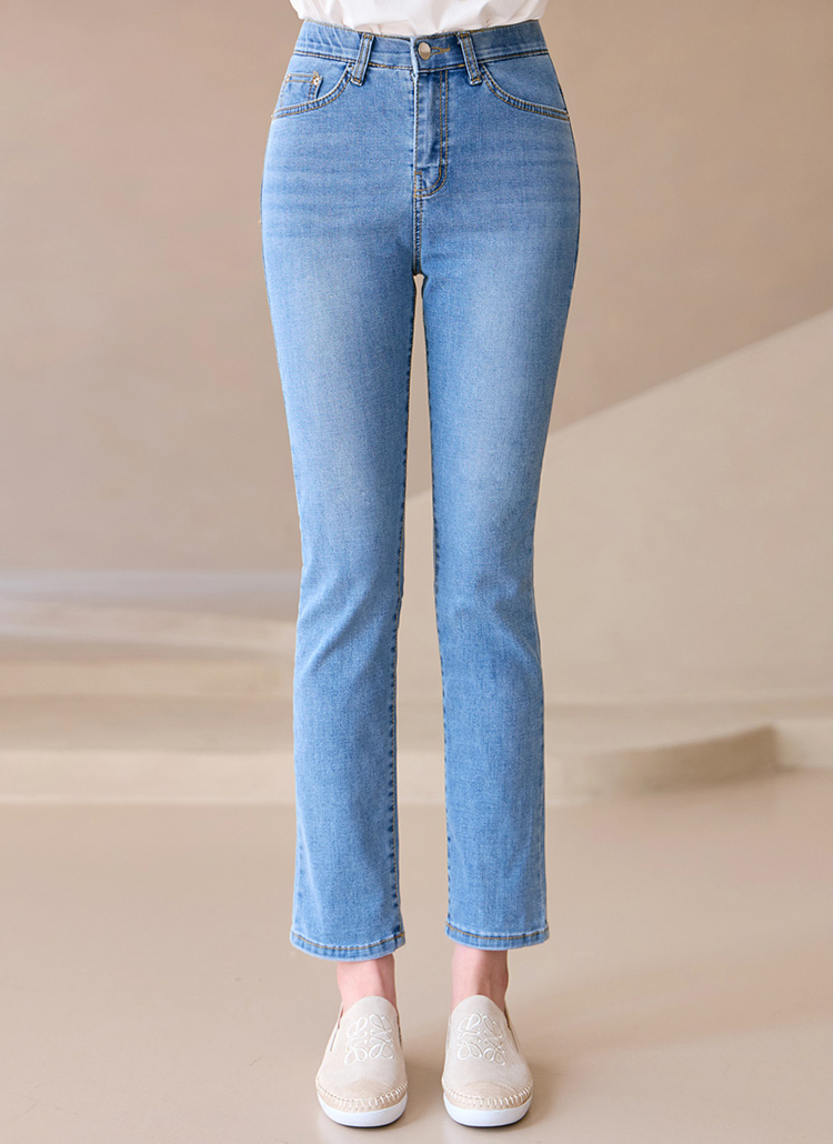 [Featuring a slim straight cut and hidden waistband, these jeans enhance your silhouette with a breathable, flexible fit.]