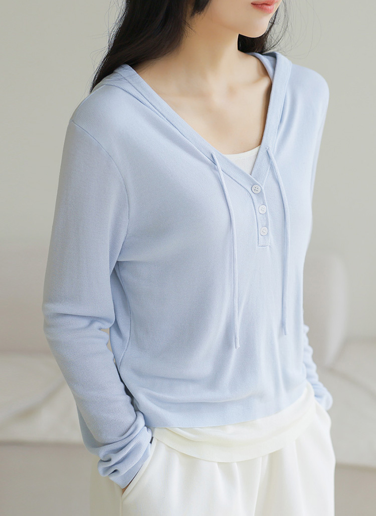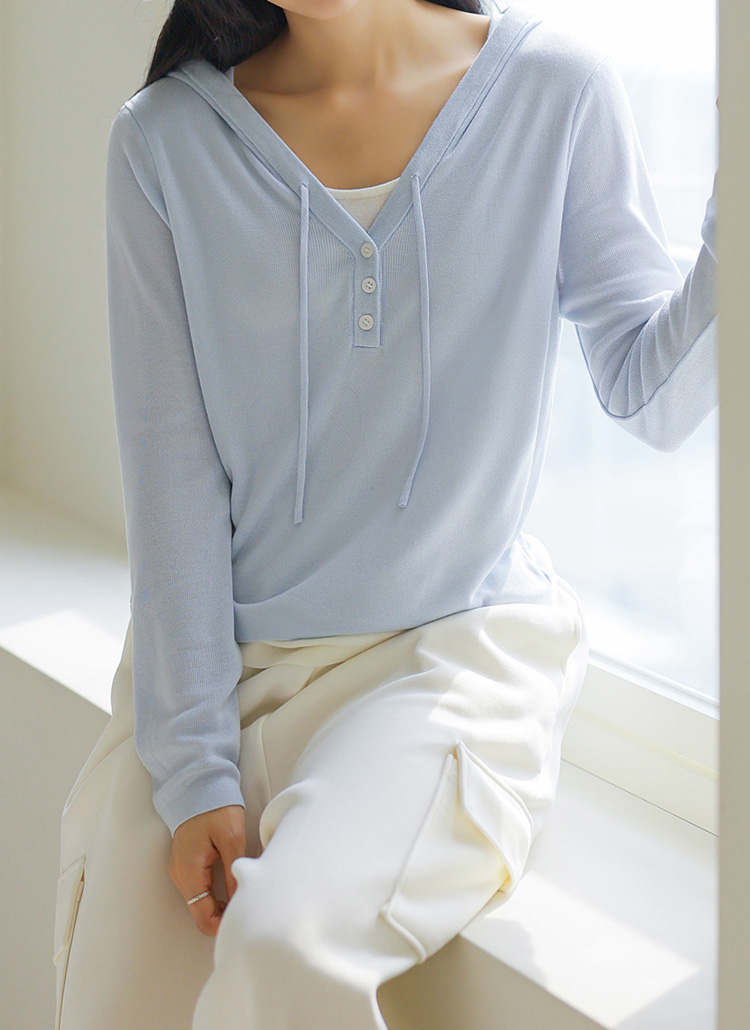 여리여리한 실루엣의 버튼 브이넥 후드 니트에요 :)