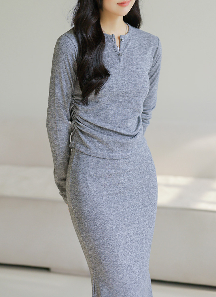 [A shirred button-neck tee and mermaid skirt duo that flatters every curve—effortless stretch and sleek, feminine lines.]