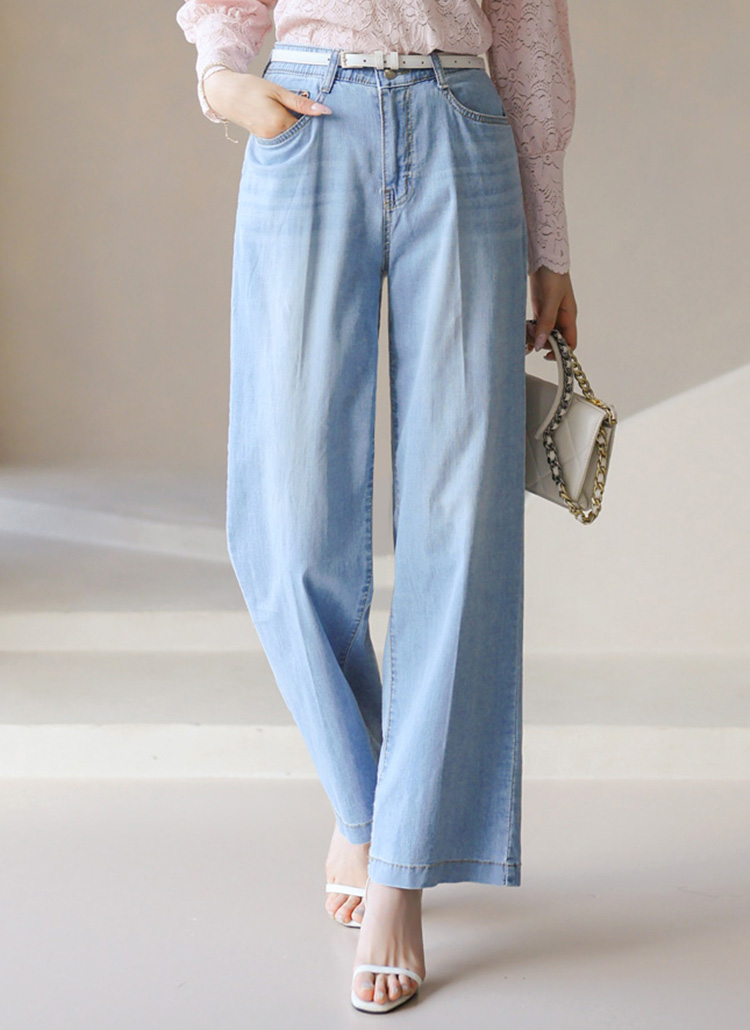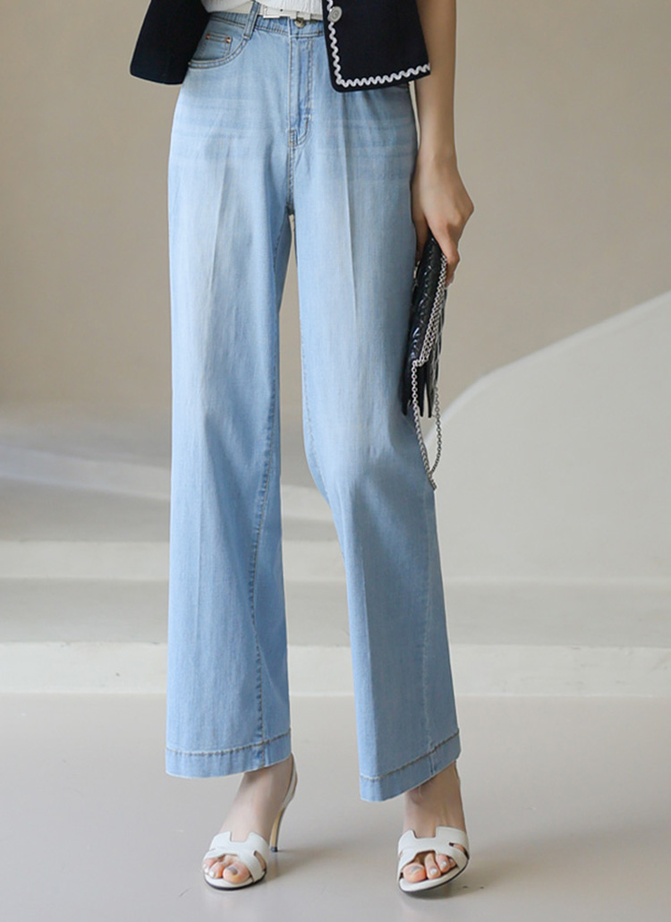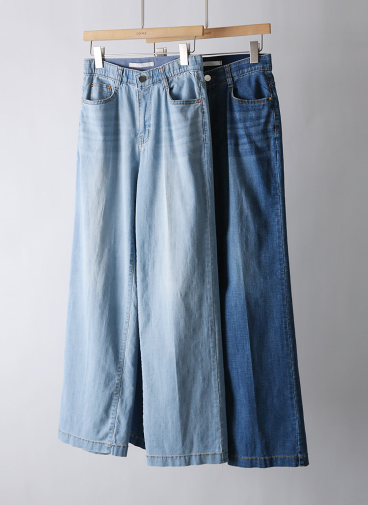 [Lightweight linen-blend denim with hidden elastic waistband for all-day comfort. Relaxed wide silhouette creates an effortlessly chic summer look.]