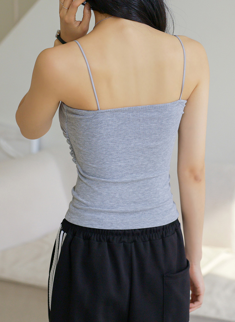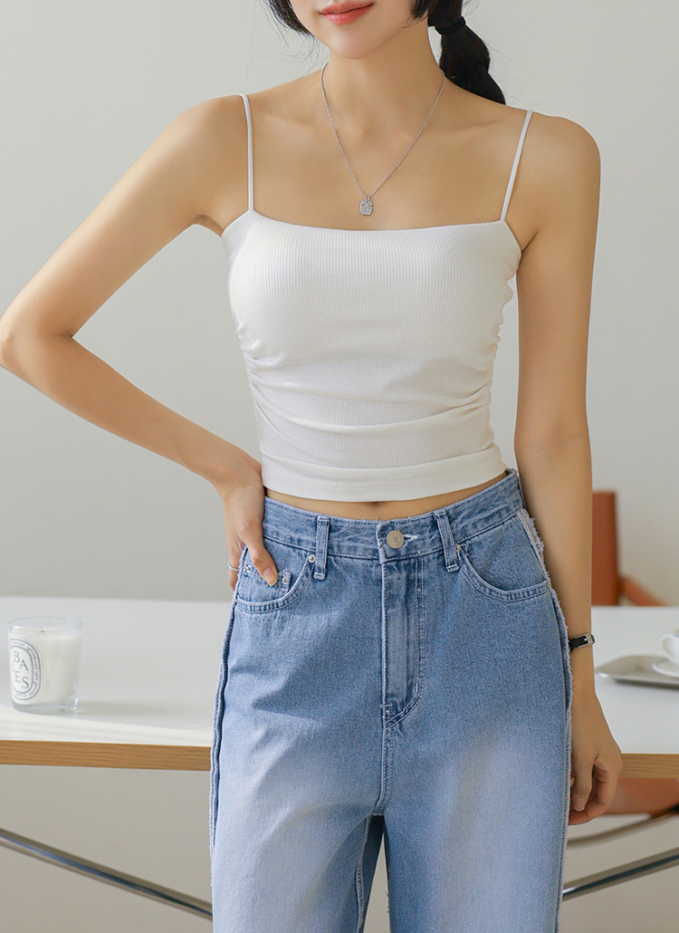[A slim ribbed cami with volume pads and subtle side shirring—wear solo or layer up, in short or long length options.]