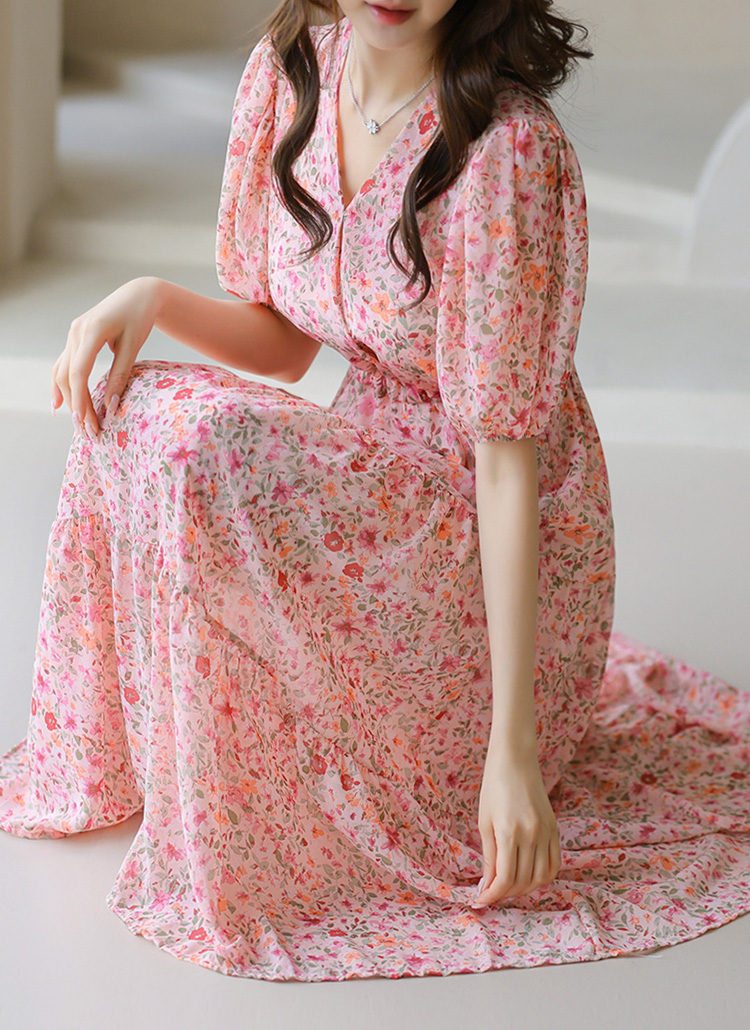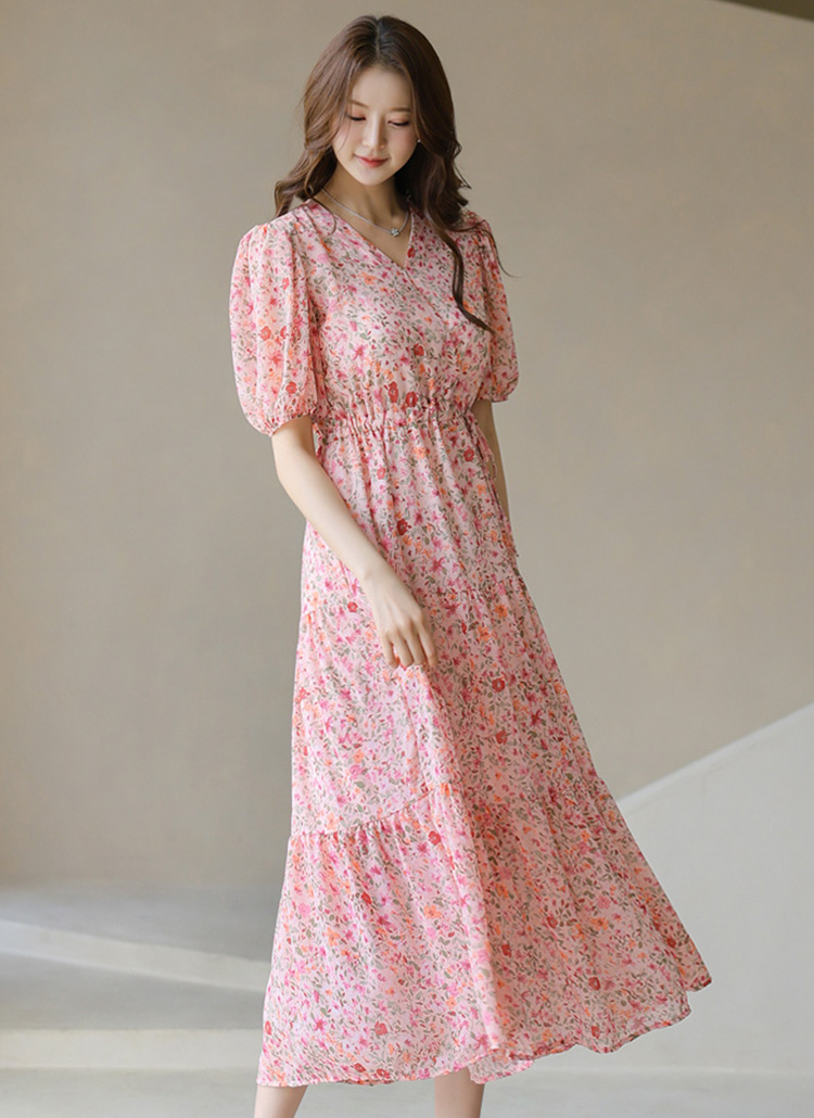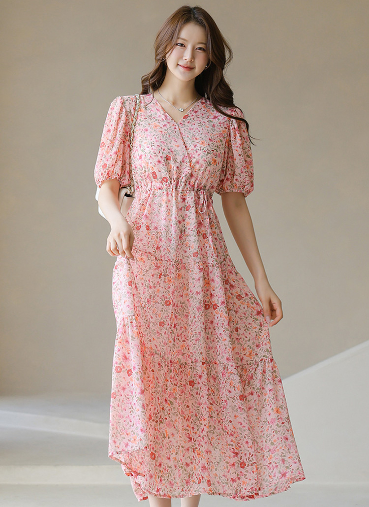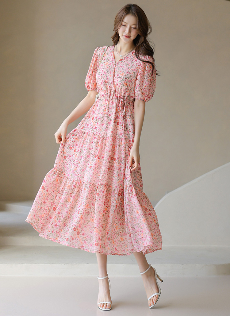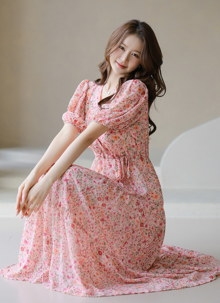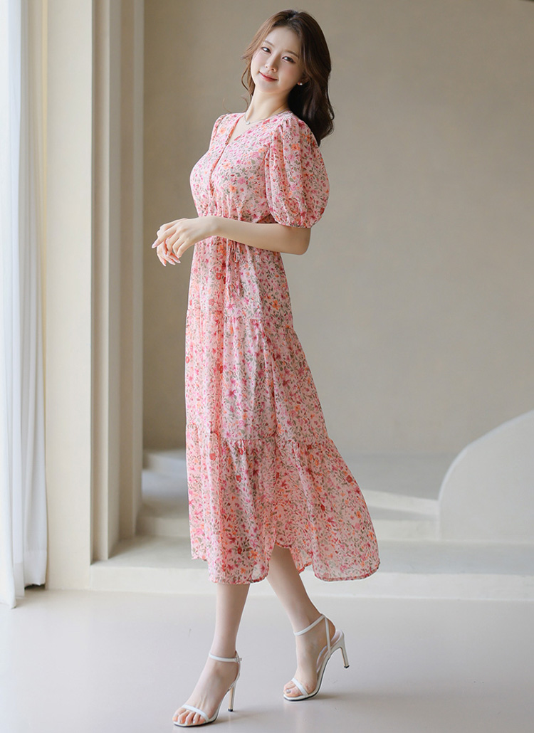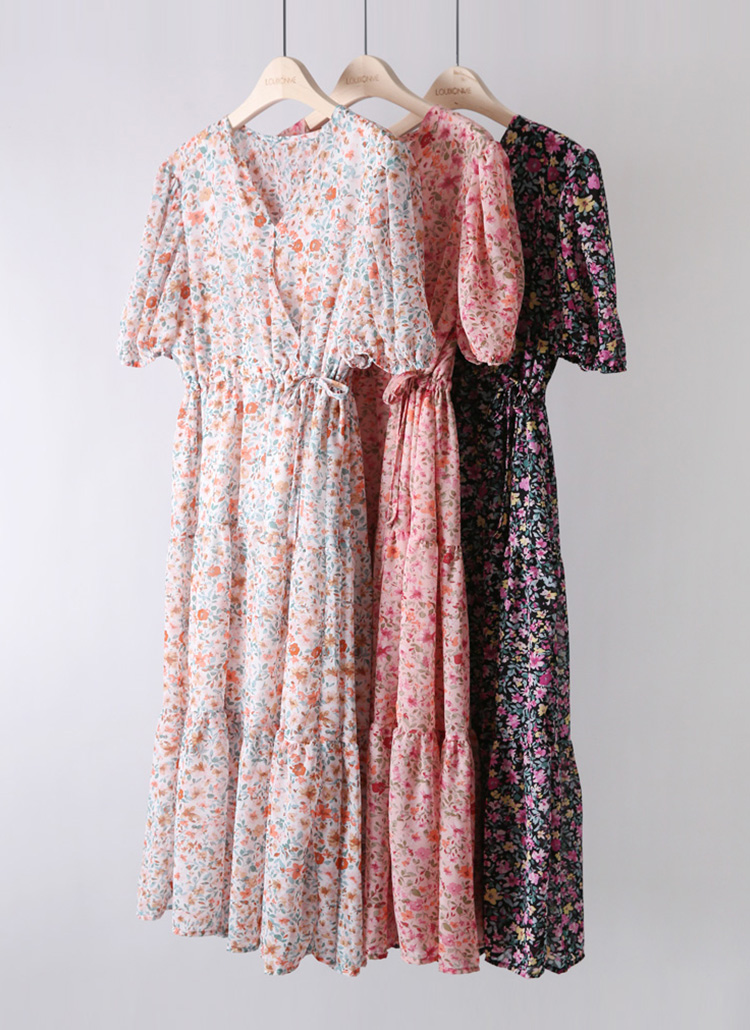 [A floral chiffon-like dress with a tiered A-line flare and waist tie—airy, flattering, and full of dreamy charm.]