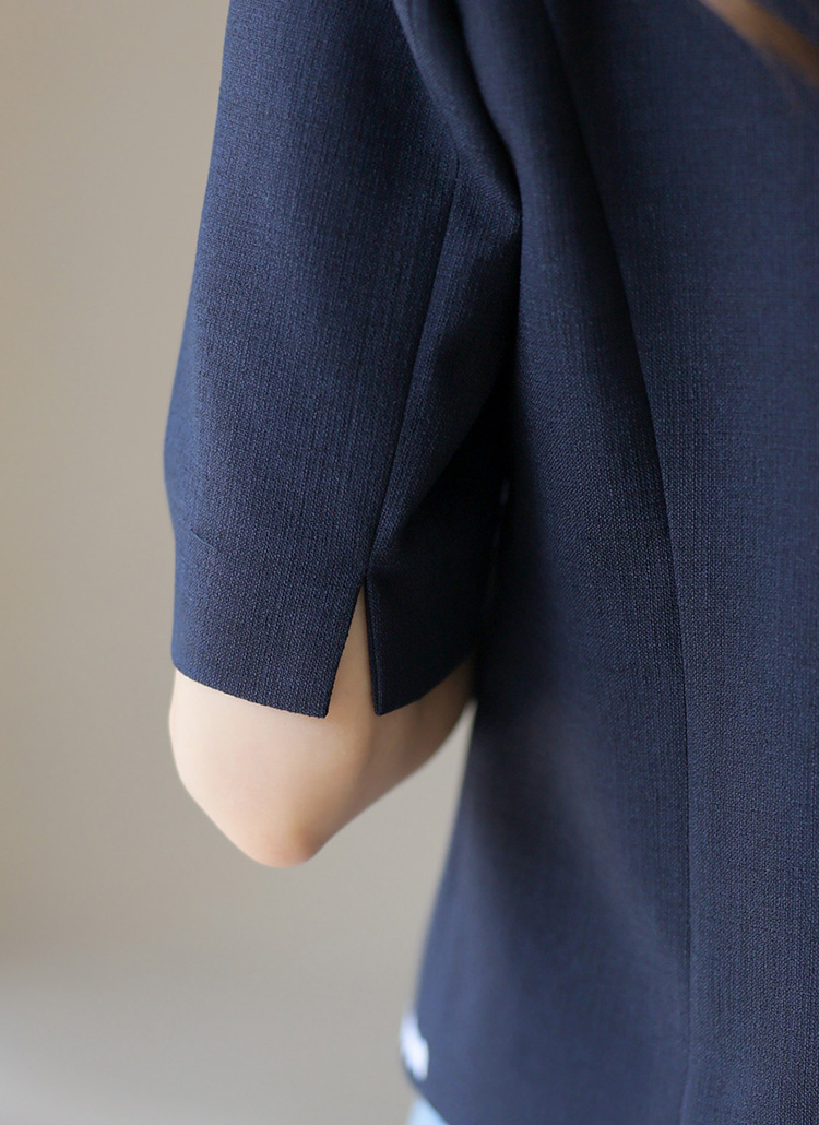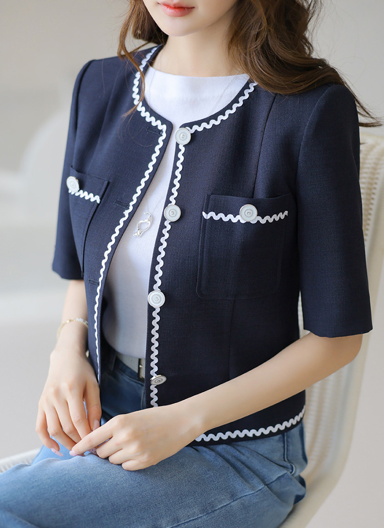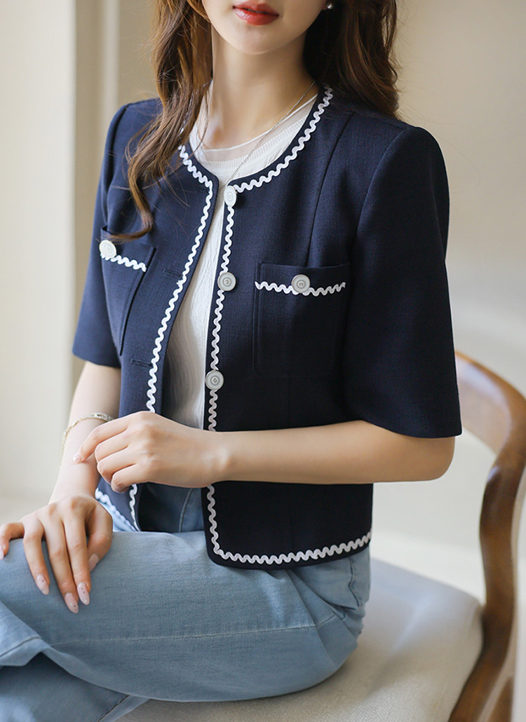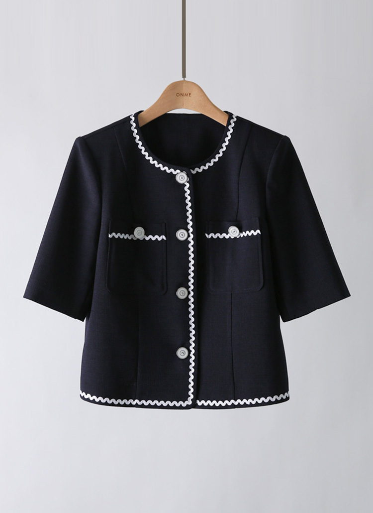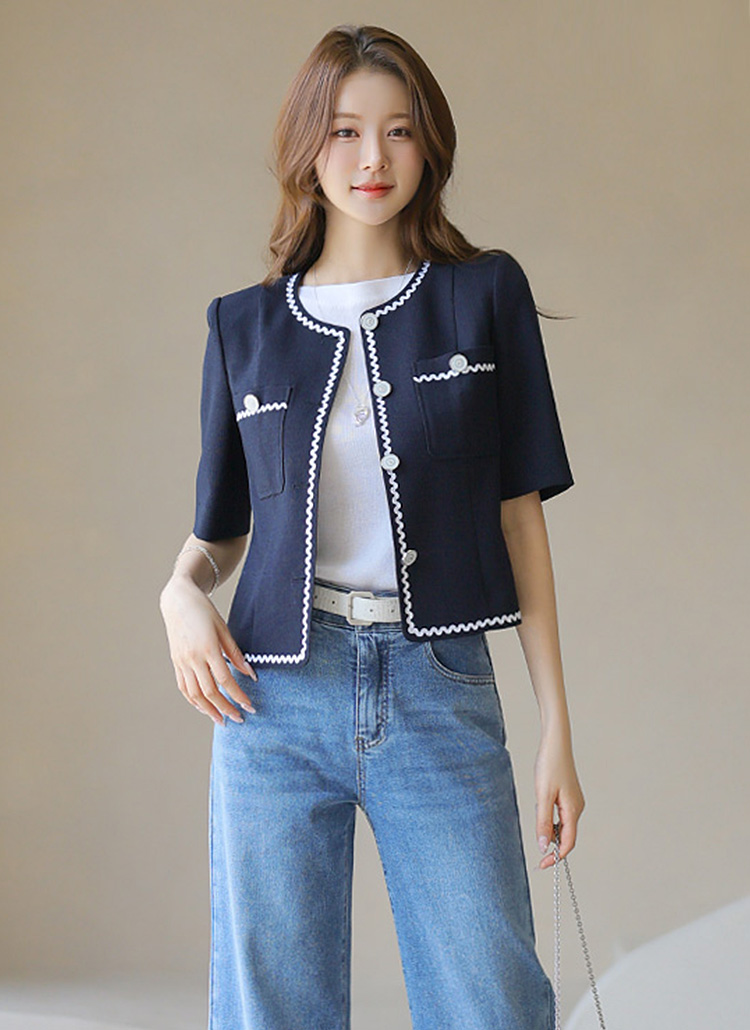 [Sleek collarless button-up jacket with playful white scallop edges—perfect for polished looks from daytime meetings to evening outings.]