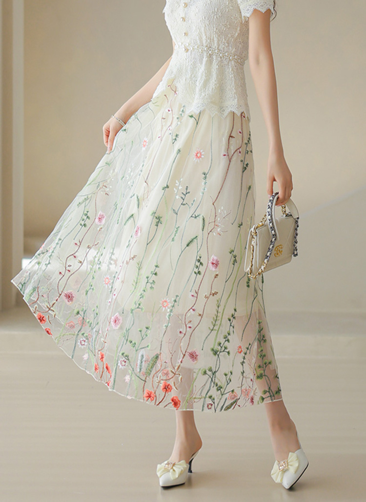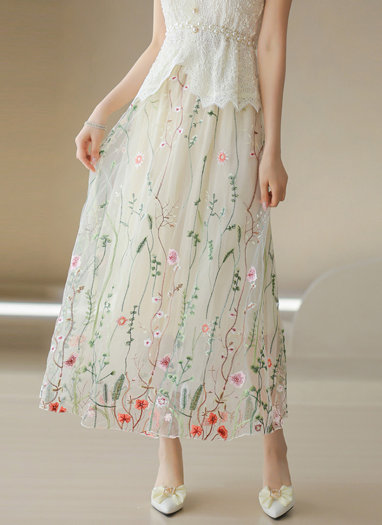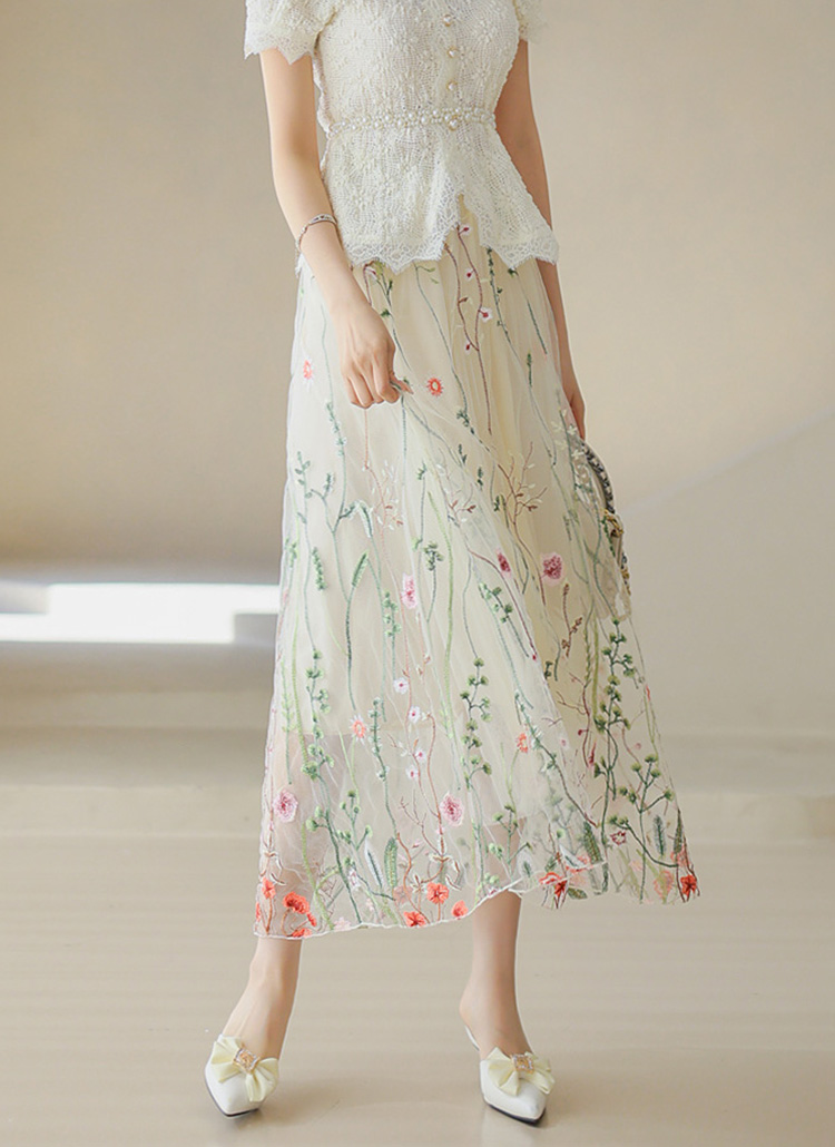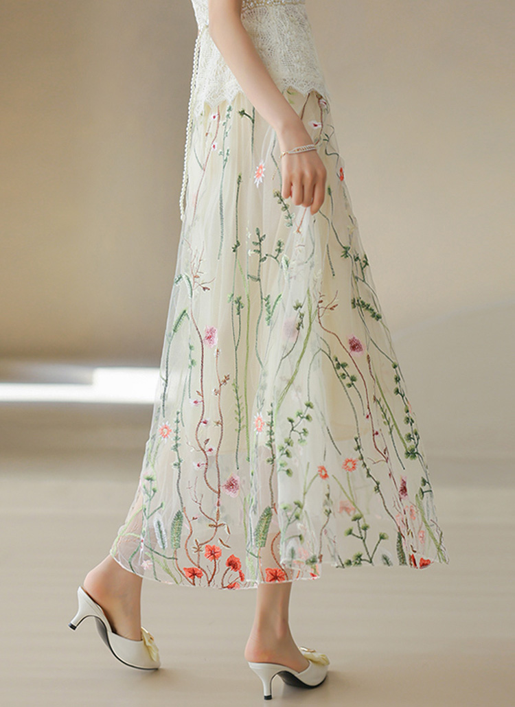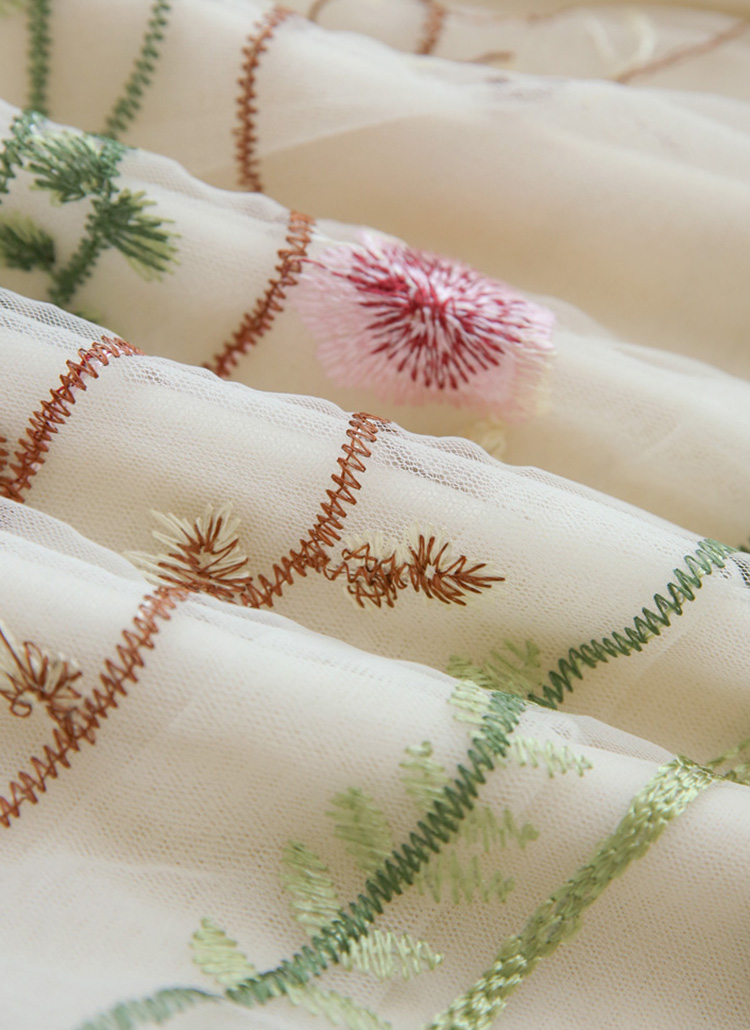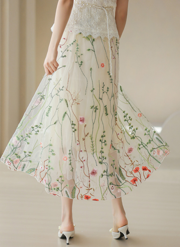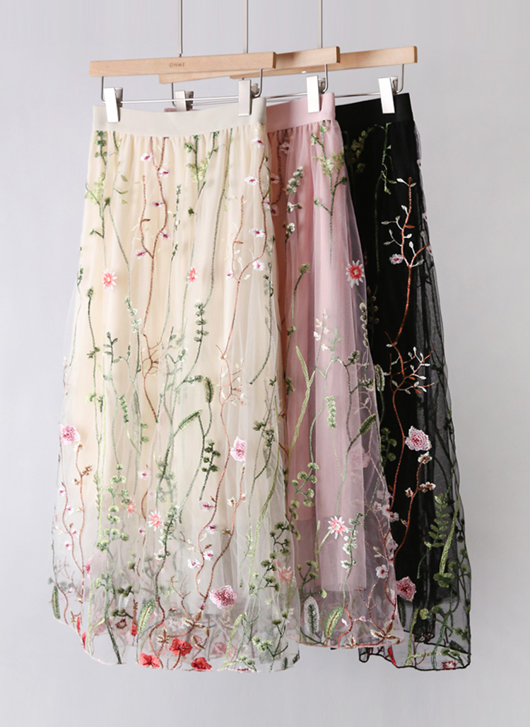 [Dreamy tulle skirt adorned with colorful embroidered botanicals. Features a lined interior and stretchy waistband for effortless romantic style.]