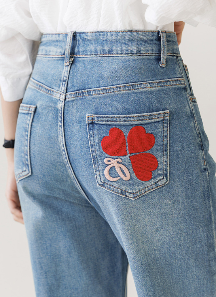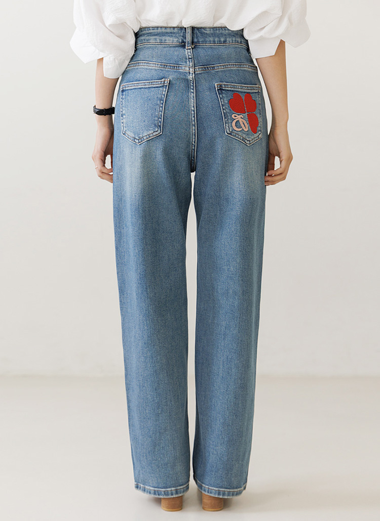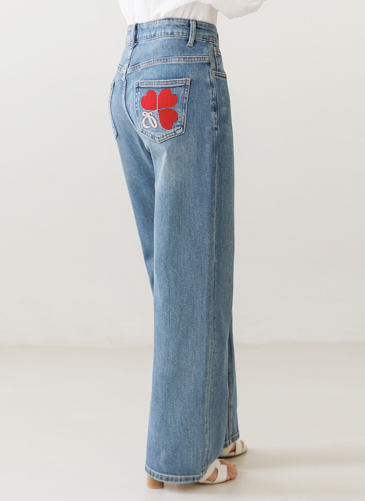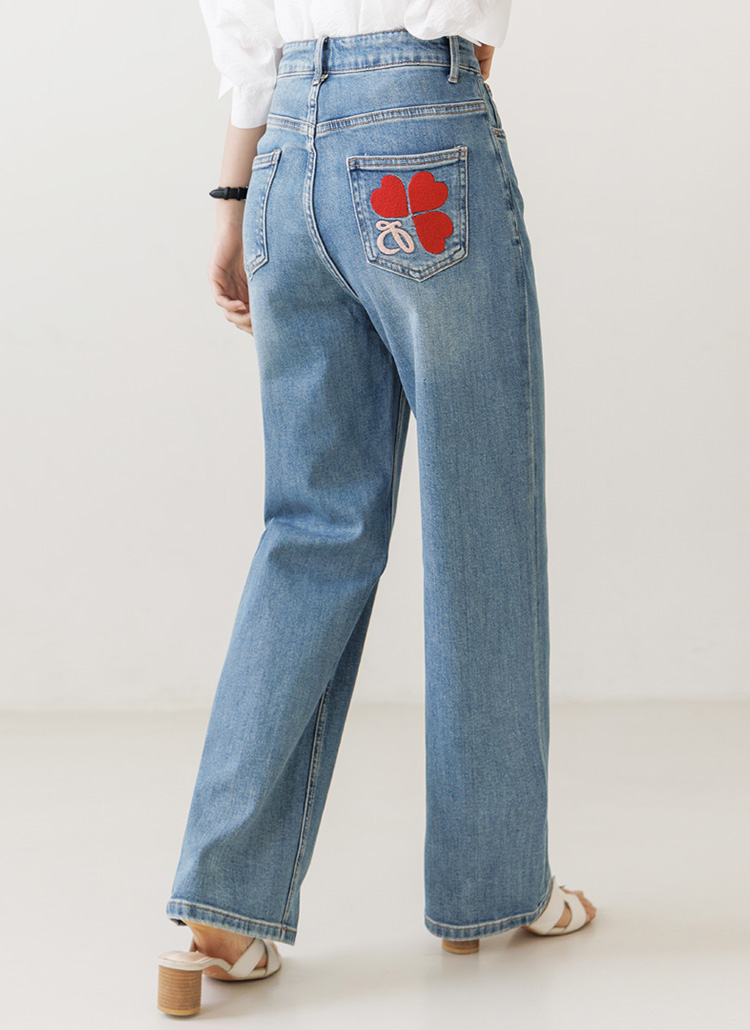 [High-waist semi-wide denim featuring a playful red heart on the back pocket for a sweet, stylish daily look.]