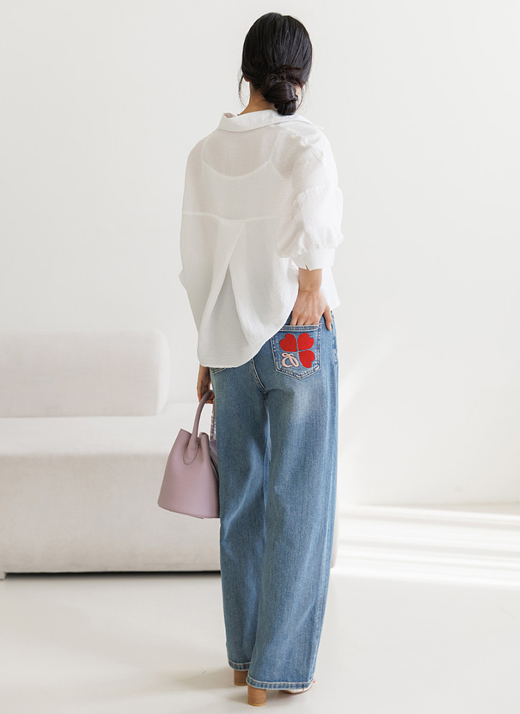 레드 컬러의 하트 자수가 힙 포켓에 화사하고 러블리한 포인트를 준
