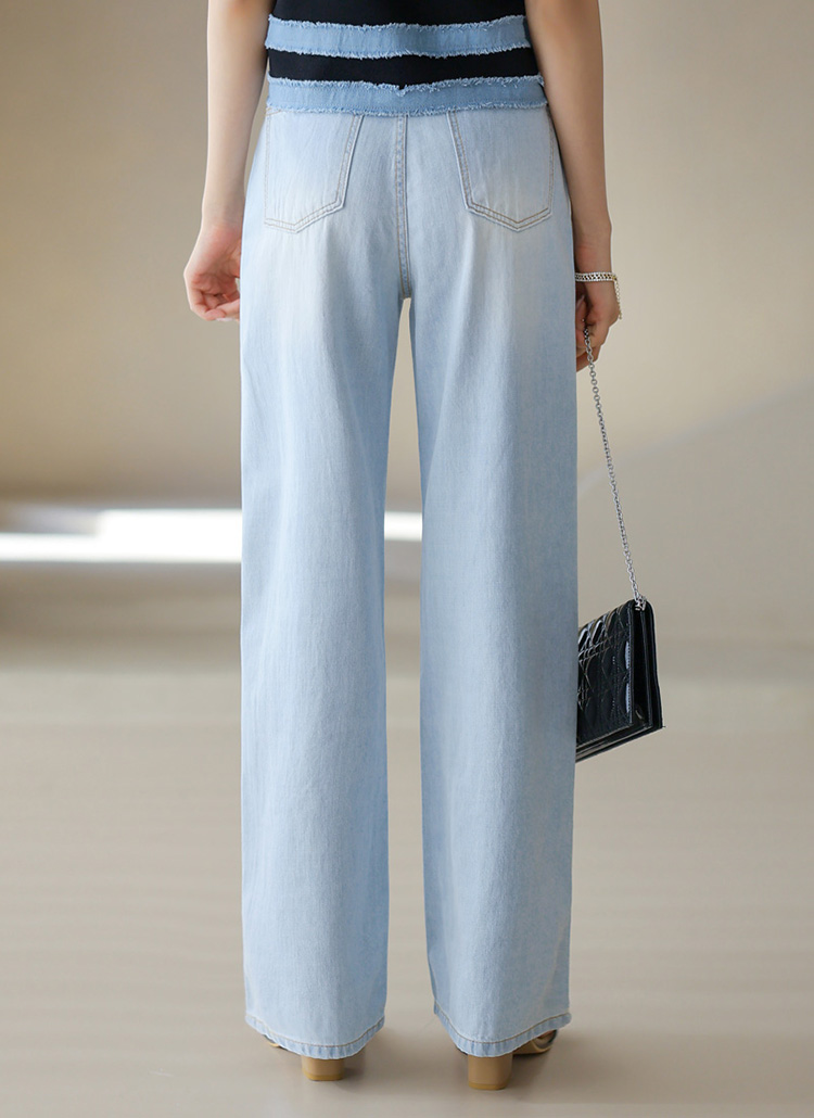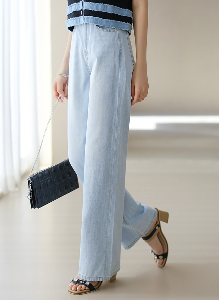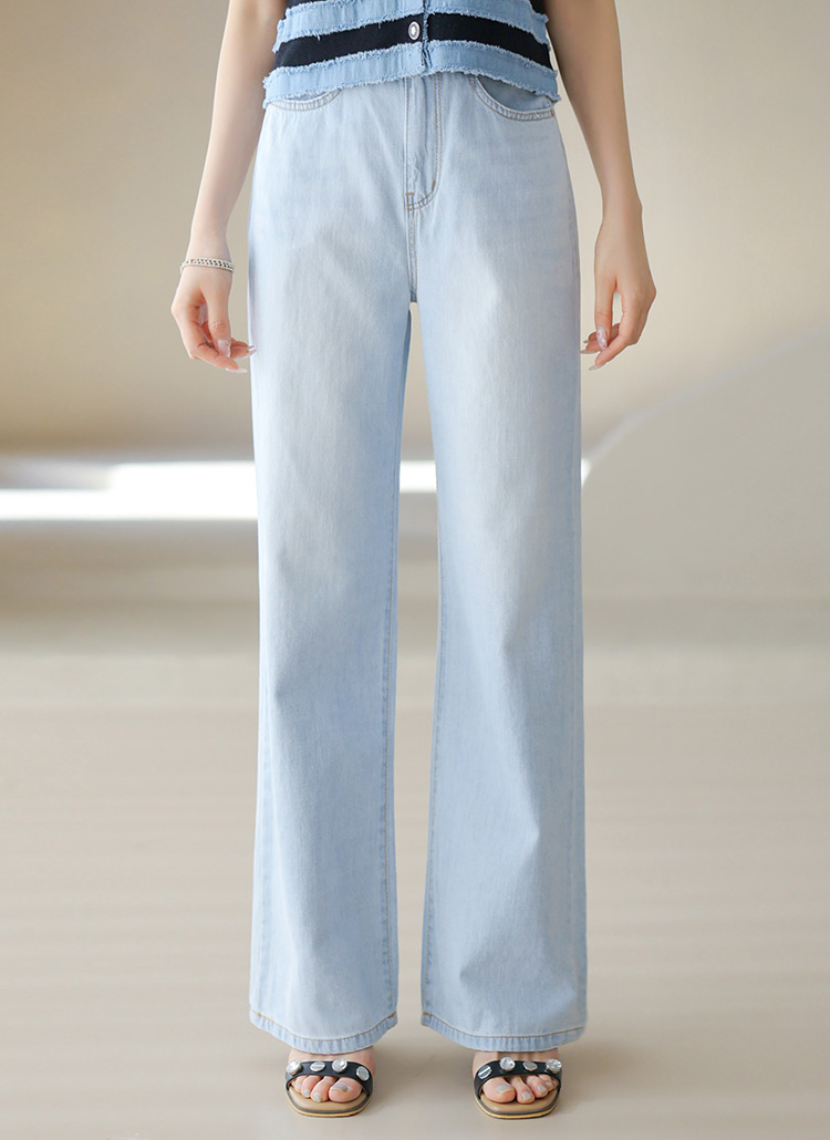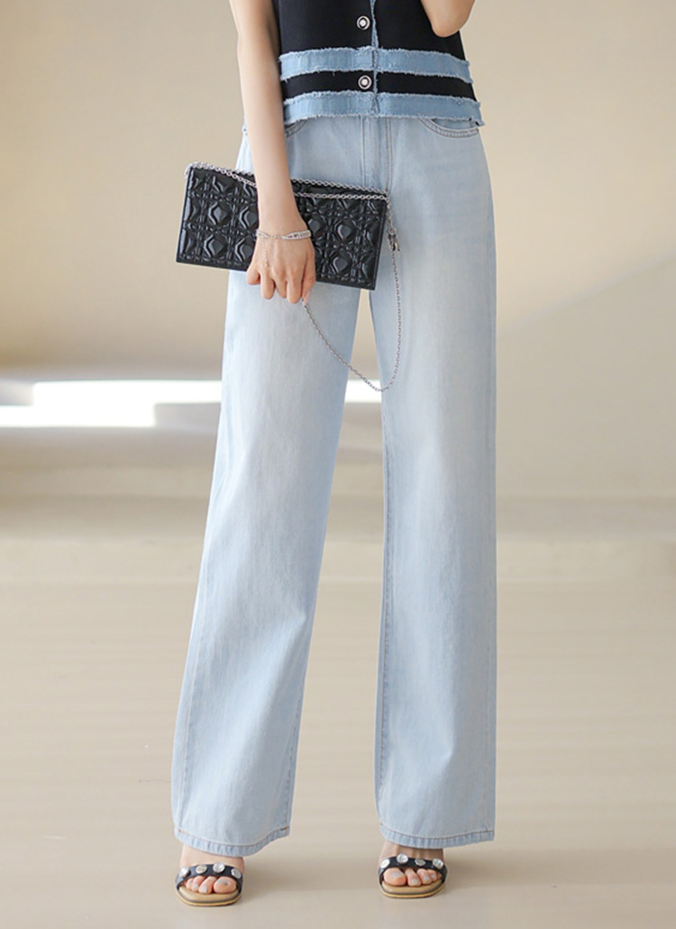 [Cool-toned washed jeans with a clean wide-leg silhouette. Soft cotton fabric keeps it breathable, sleek, and comfy.]