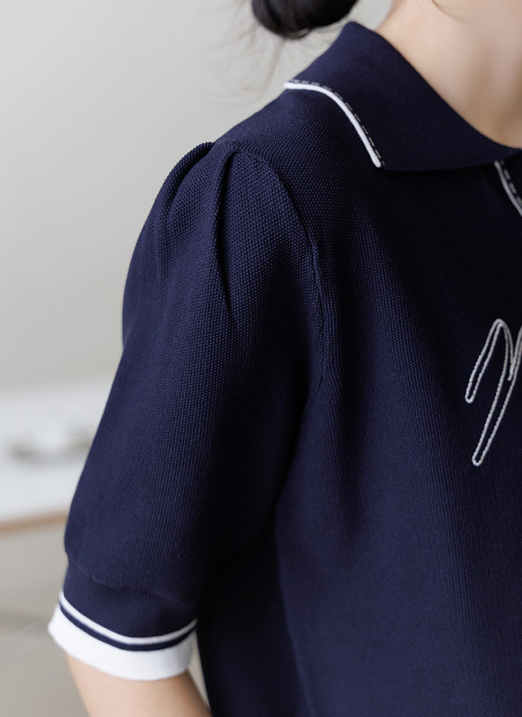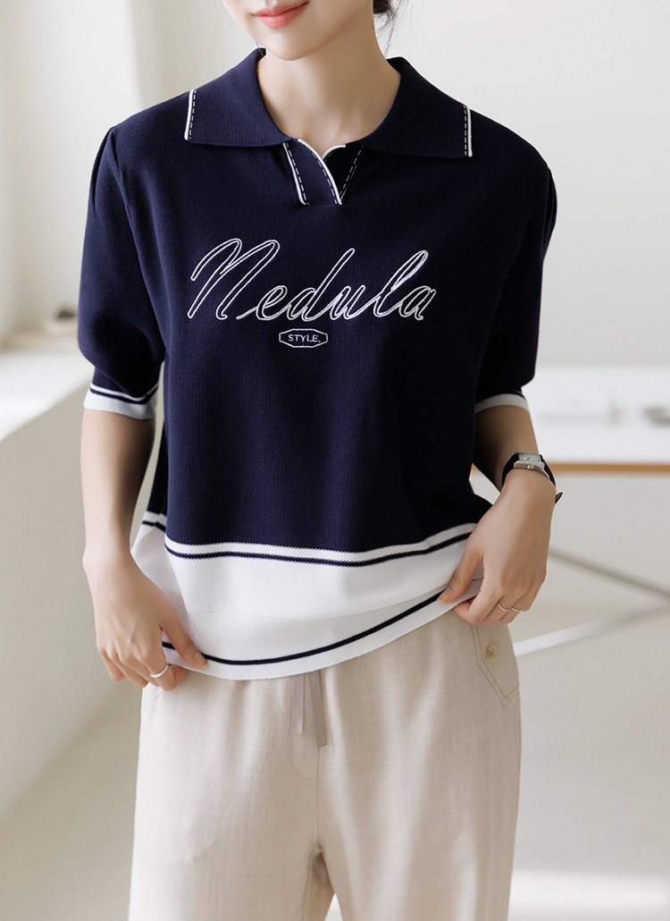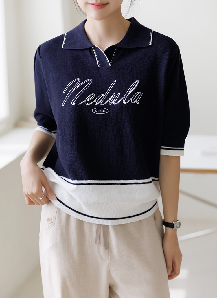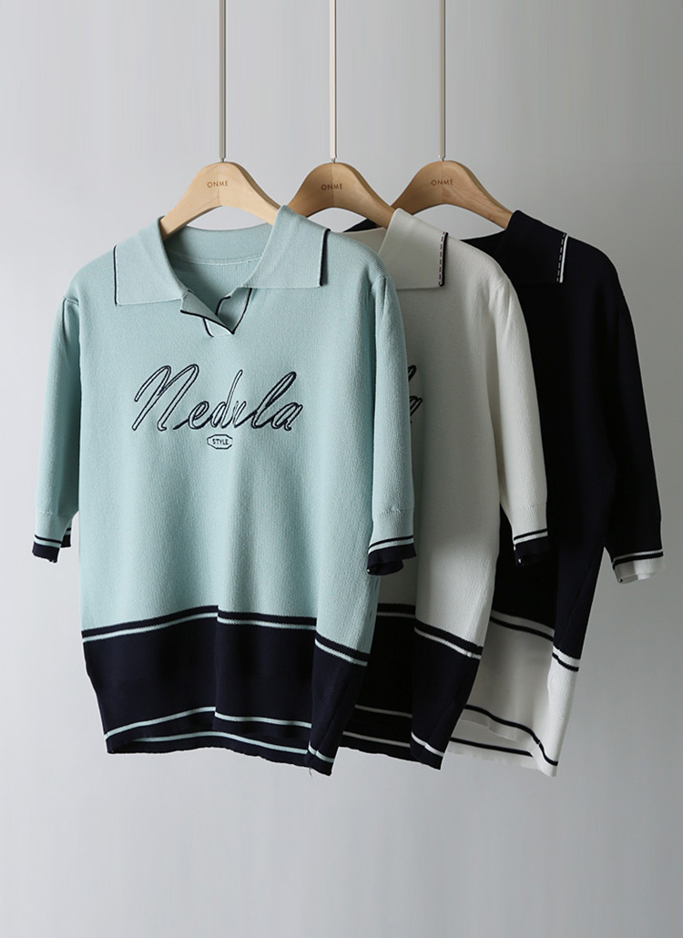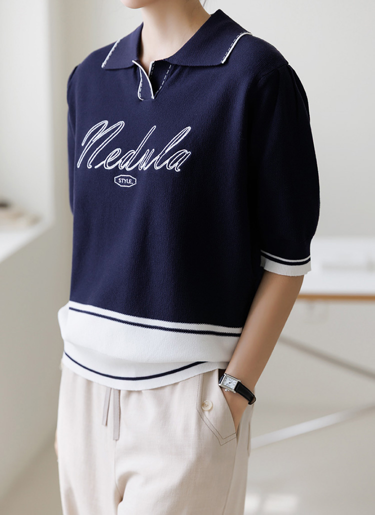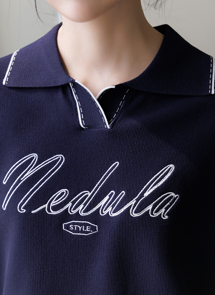 [Open collar knit with bold contrast stitching and lettering. Cool-touch fabric keeps it breezy and perfect for daily wear.]