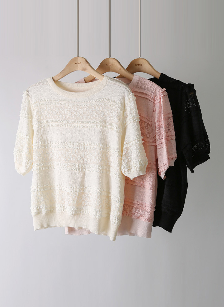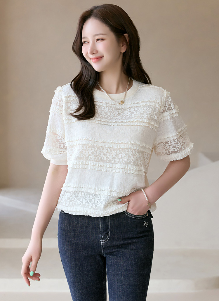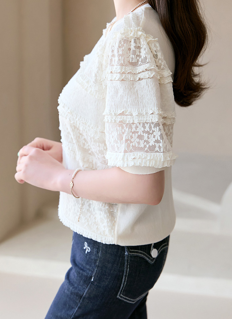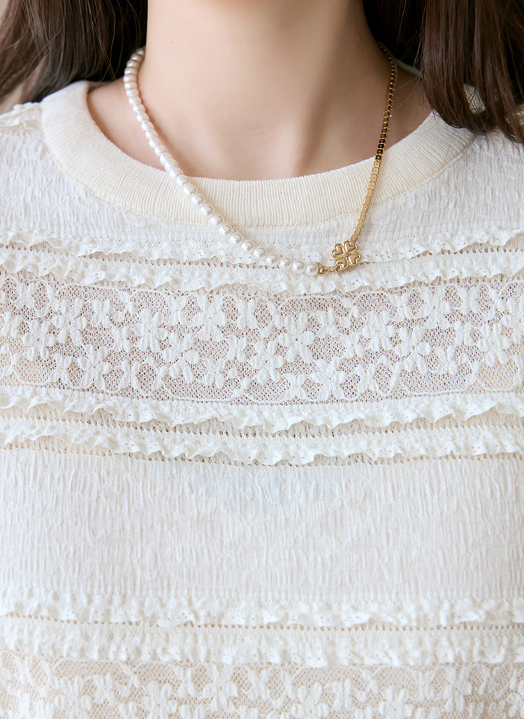 [Designed for comfort and style—this tee offers lace frills and a cozy knit back, making it perfect for easy, feminine looks.]