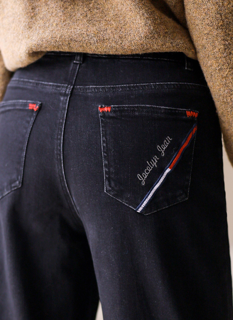 사선으로 들어간 백포켓 자수 디테일이 세련된 멋스러움을 선사하는