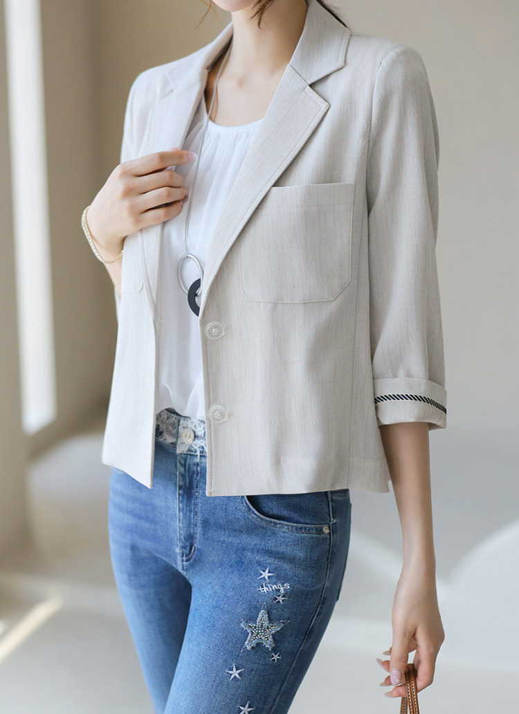 [Light and crisp with a linen-like feel, this 3/4 sleeve cropped blazer adds polish and cool comfort to any summer look.]