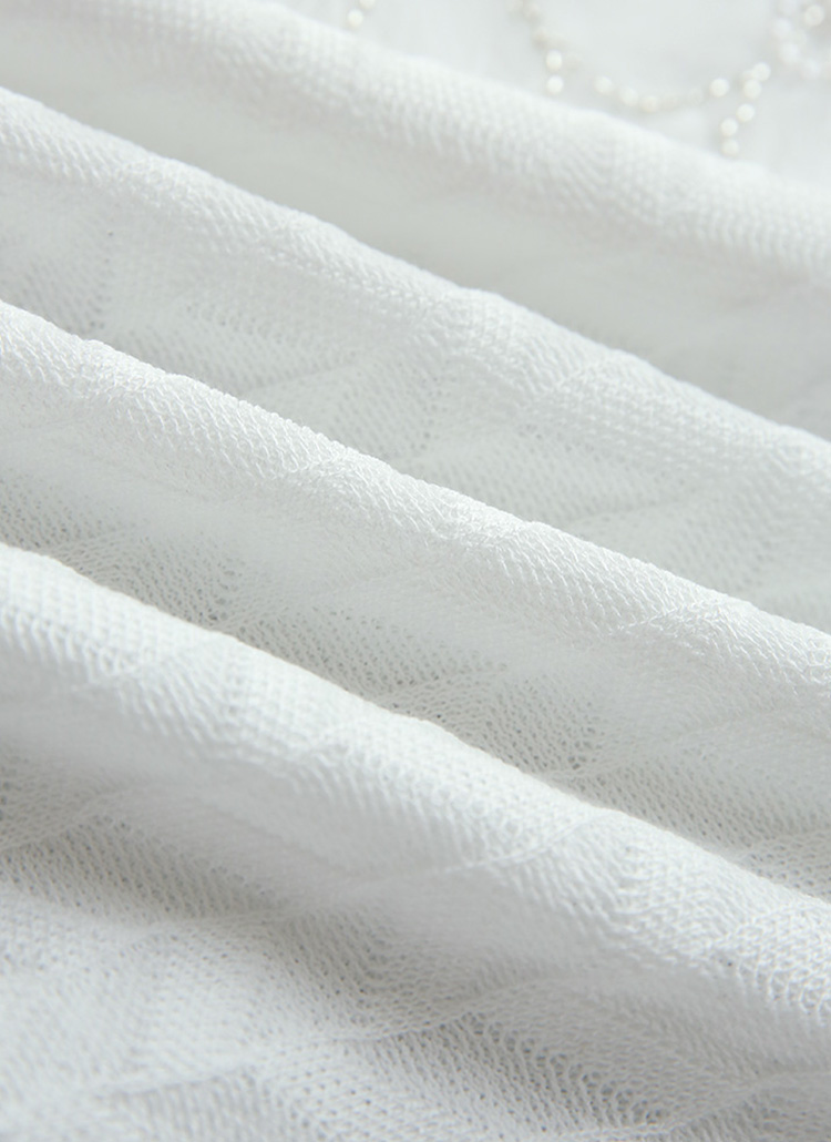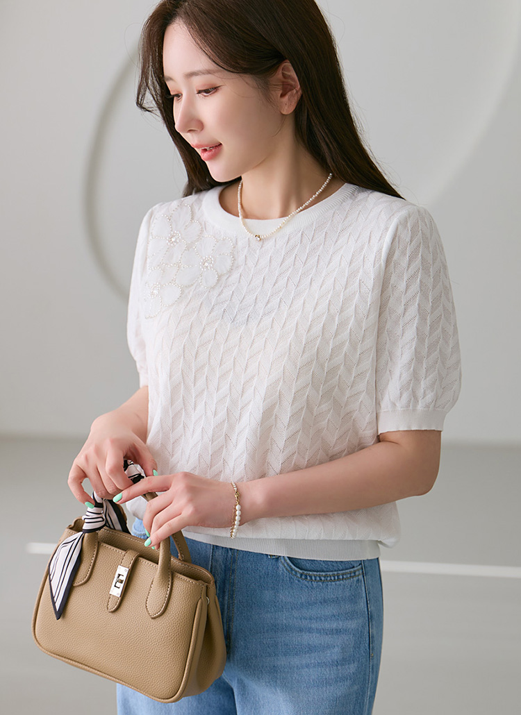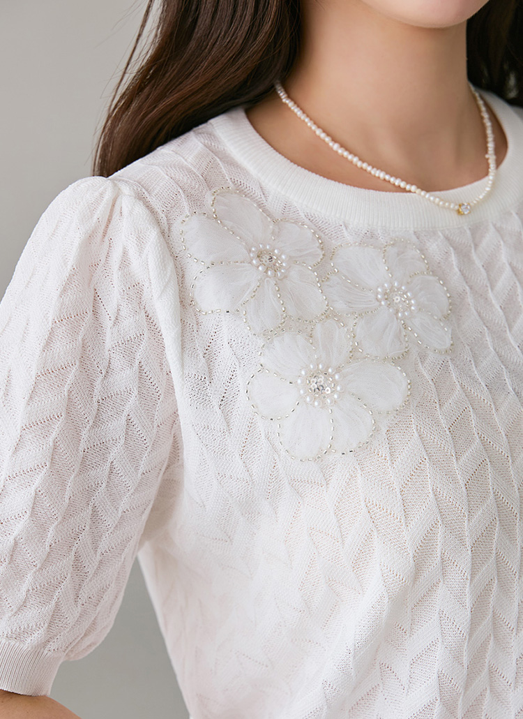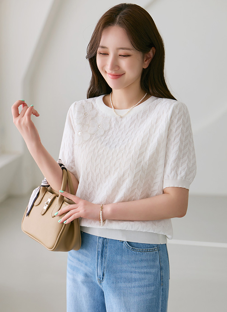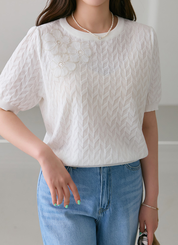 [Delicate lace bloom with pearl accents adds charm to this lightweight, patterned knit—perfect for effortless styling.]