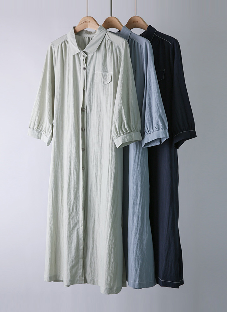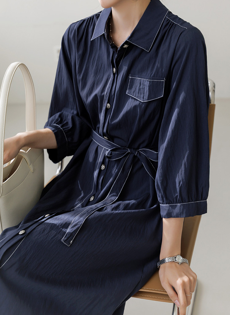 [Crisp shirt dress with silver buttons, contrast stitching, and a waist belt—designed for cool elegance and effortless movement.]
