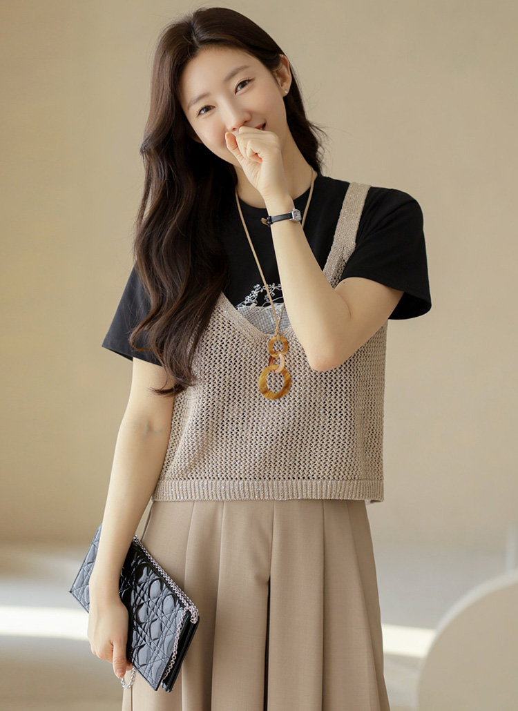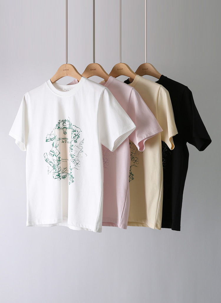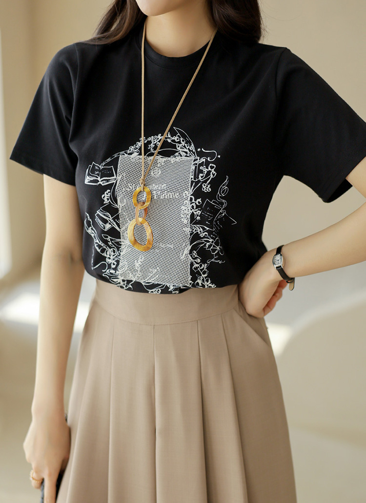 [This lightweight round-neck tee features an artsy print and French text, blending charm with breathable comfort.]