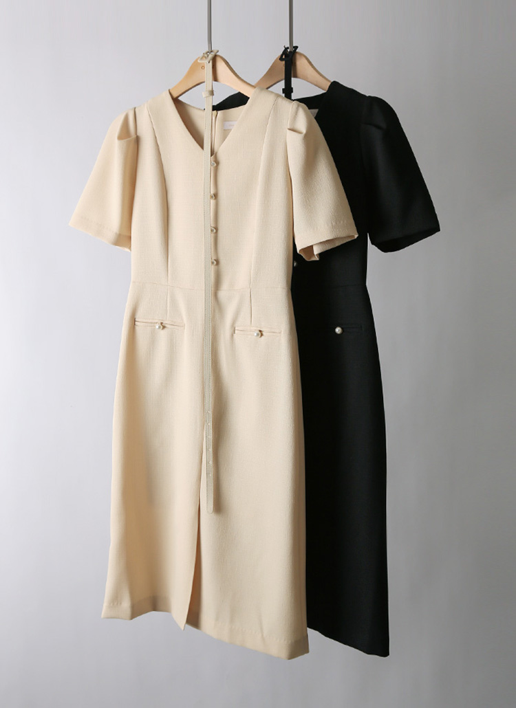[A feminine H-line dress with pearl buttons, puff sleeves, and a matching belt that defines the waist with graceful elegance.]