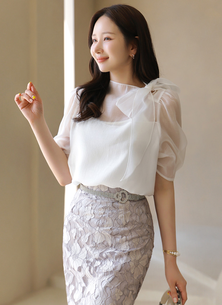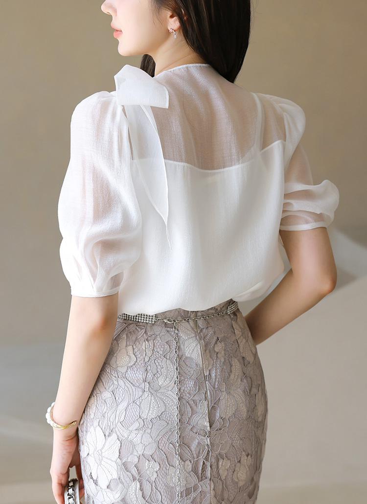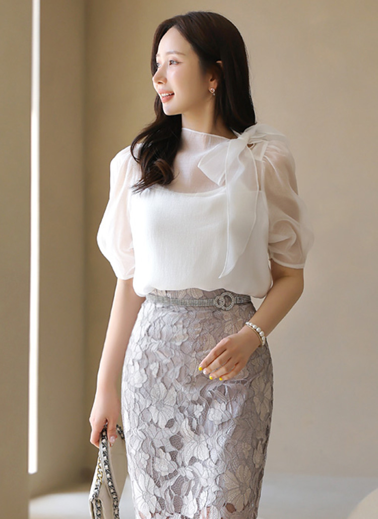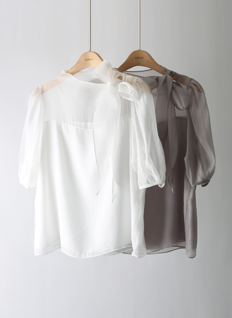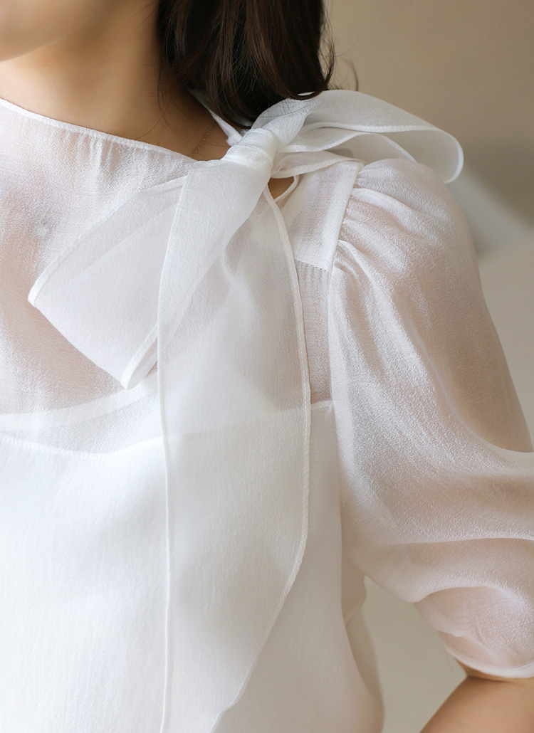 [With a subtle sheen and sheer chiffon sleeves, this tie-neck blouse brings soft volume and graceful femininity.]
