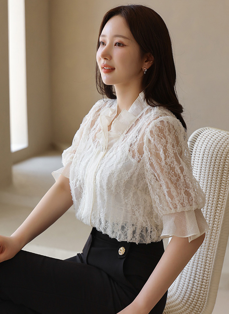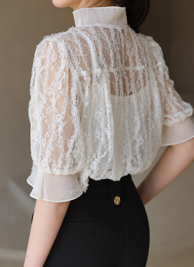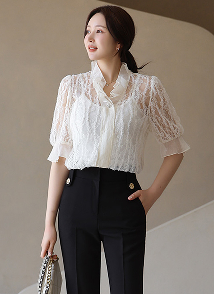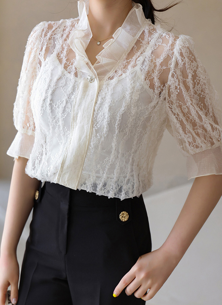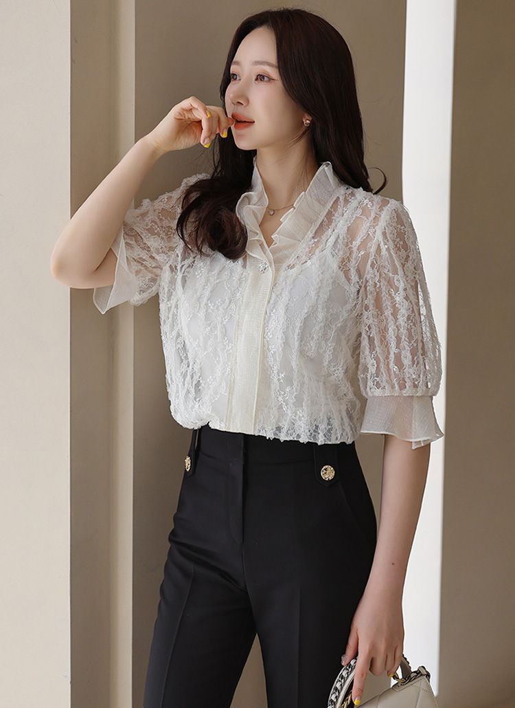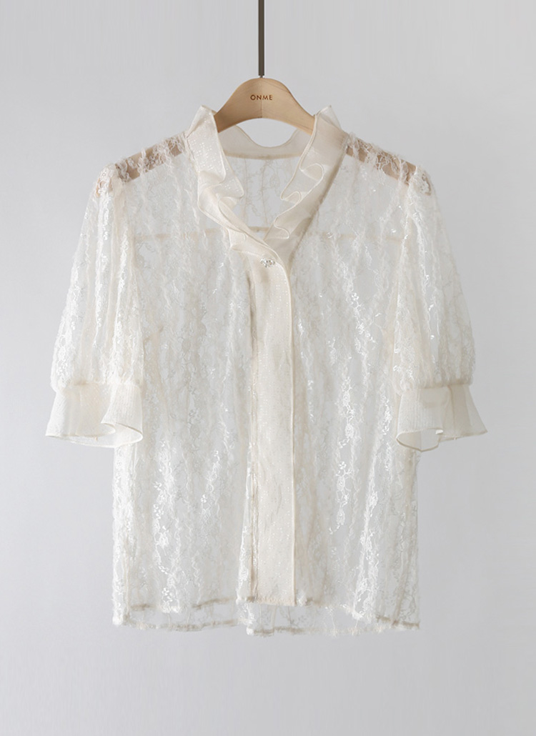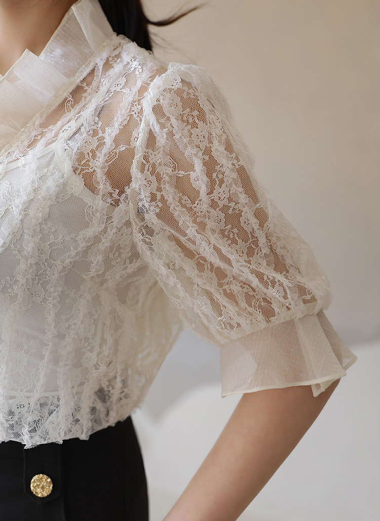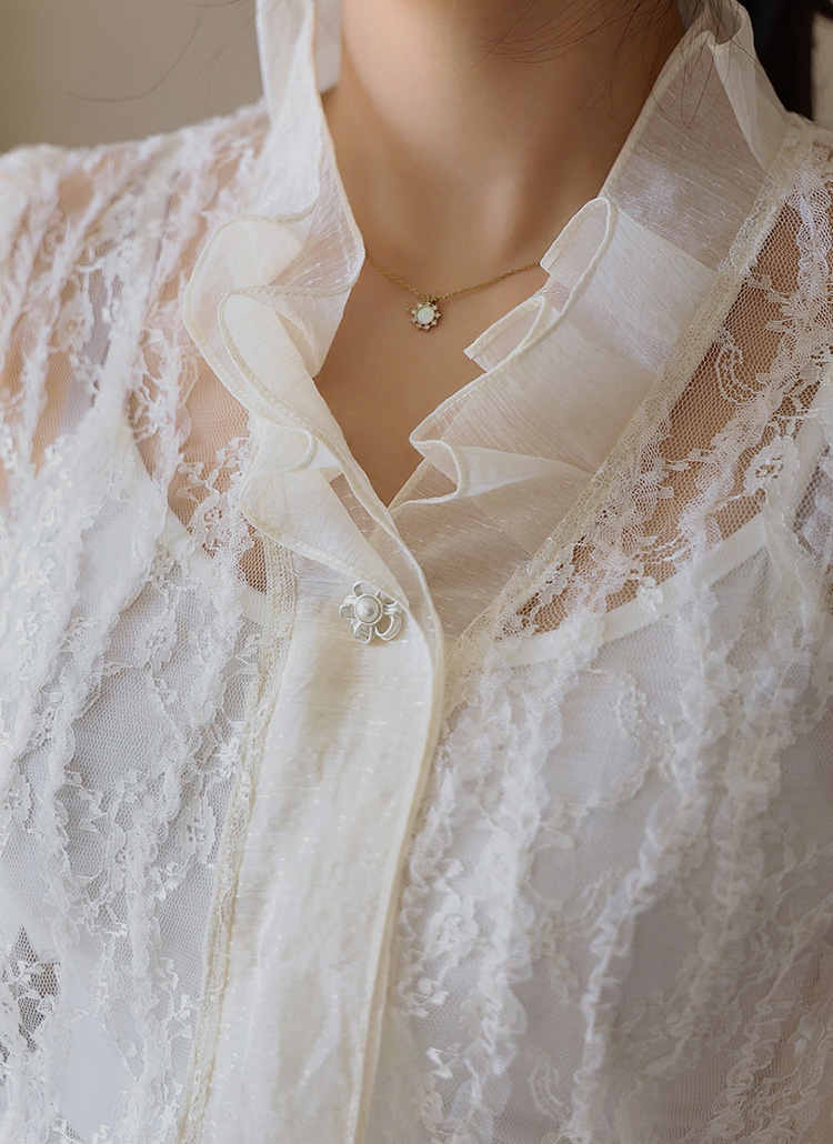[Romantic double-ruffle neckline and petal-edged sleeves elevate this sheer lace blouse with graceful flair.]