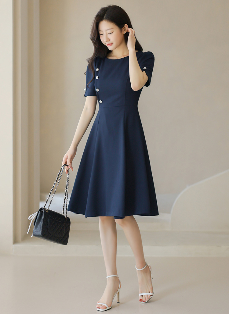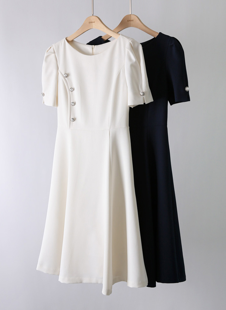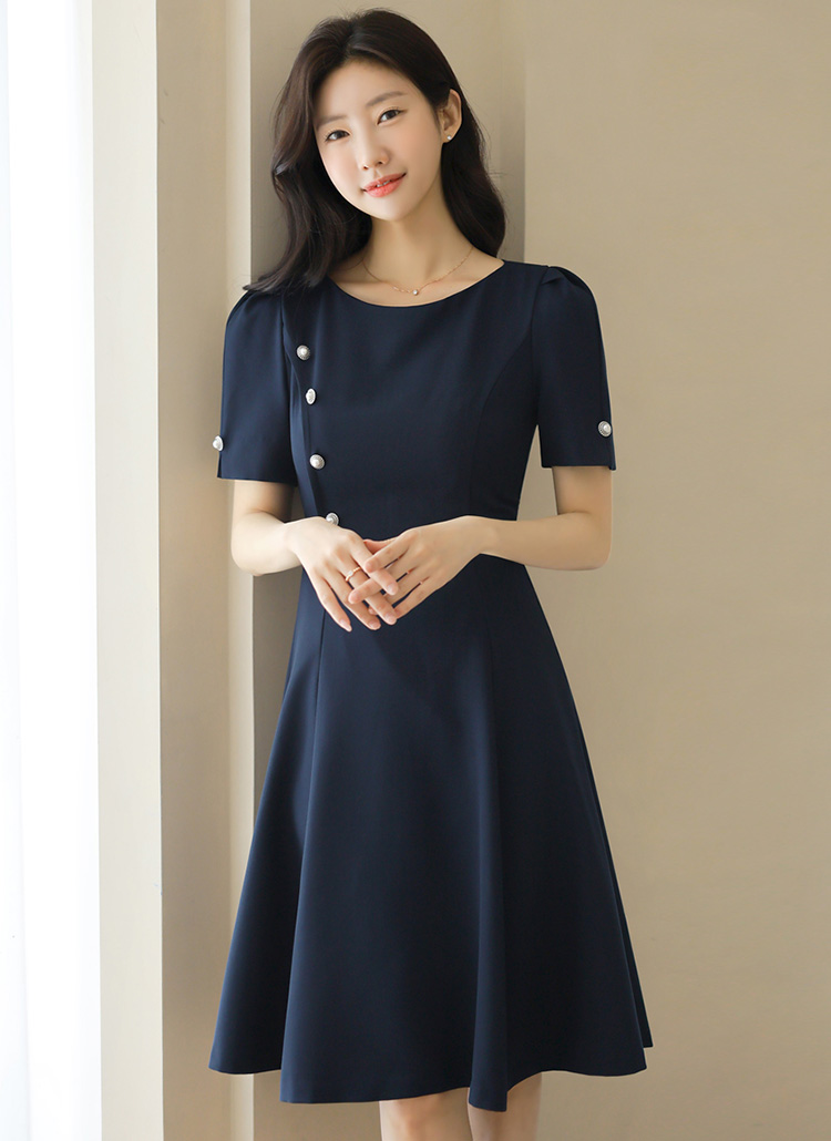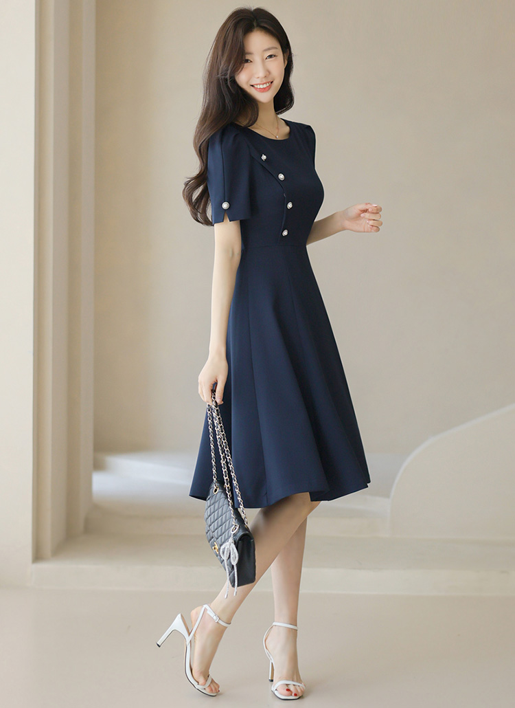 [A feminine A-line midi dress with bold pearl side buttons and princess seams for a sleek, graceful silhouette.]