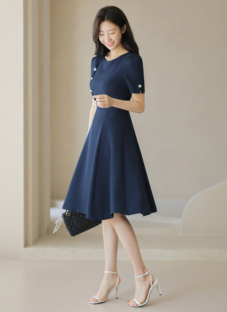 [A feminine A-line midi dress with bold pearl side buttons and princess seams for a sleek, graceful silhouette.]