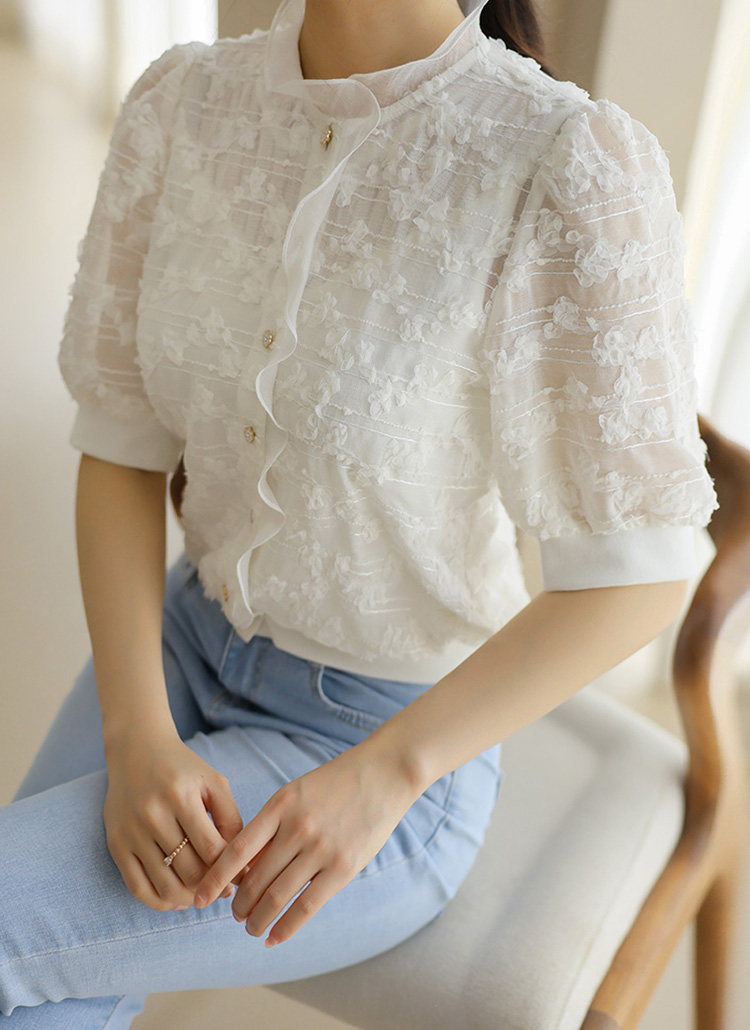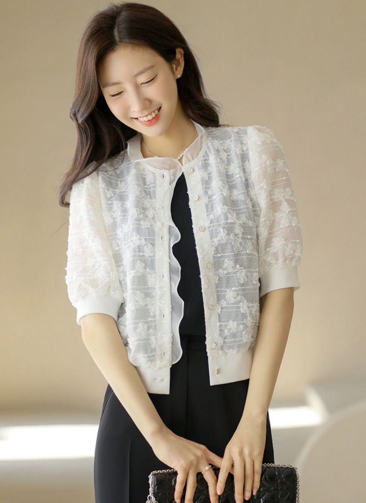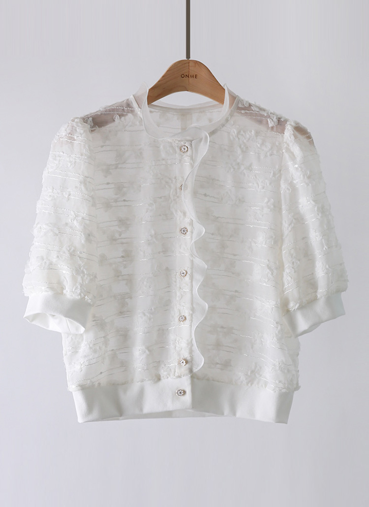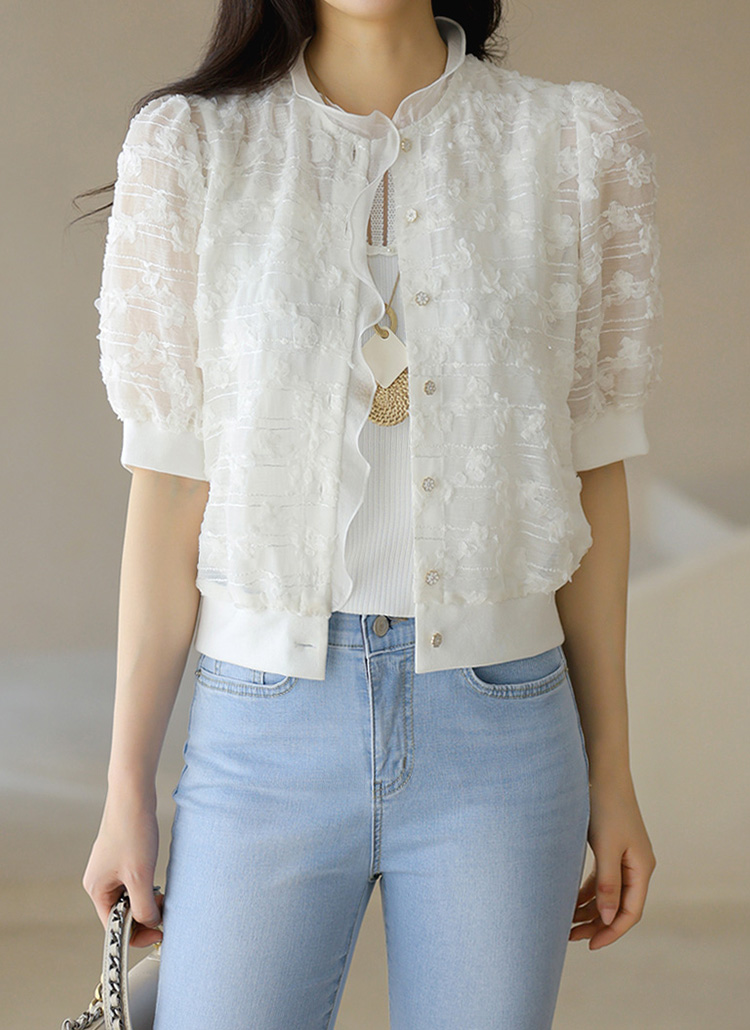 [With 3D floral jacquard and soft ruffles, this sheer blouse-jacket brings a feminine glow to any look.]