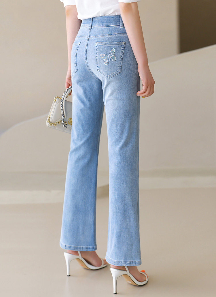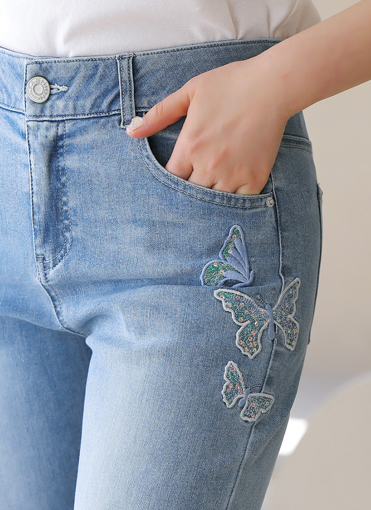 [Charming light wash denim featuring whimsical butterfly embroidery with sequin accents. Hidden elastic waistband and stretch fabric ensure perfect comfort.]