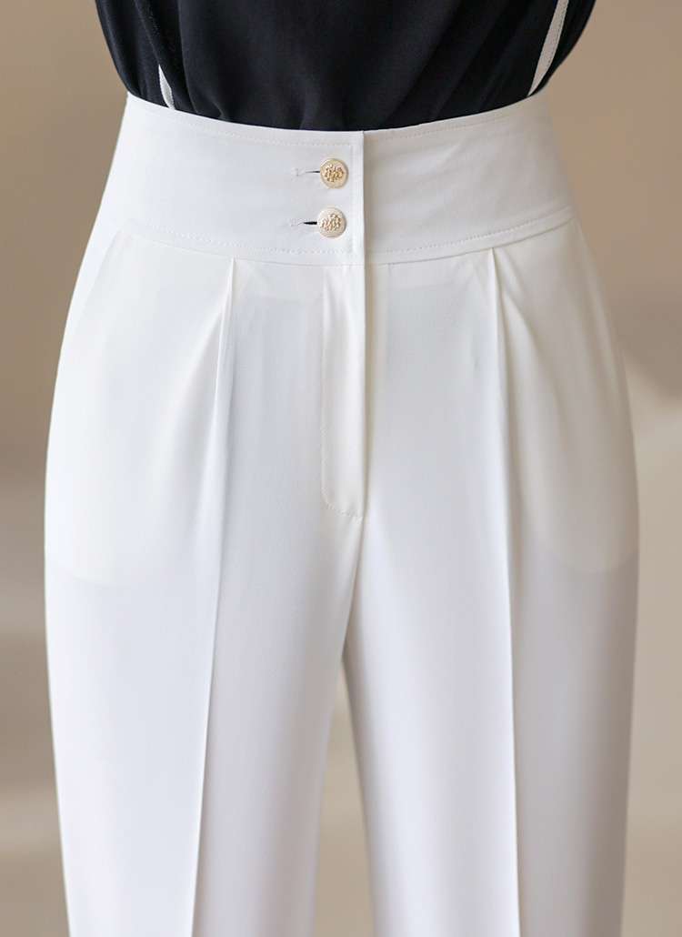[Gold buttons and a sleek pintuck line add polish to these flattering high-waist wide-leg trousers.]