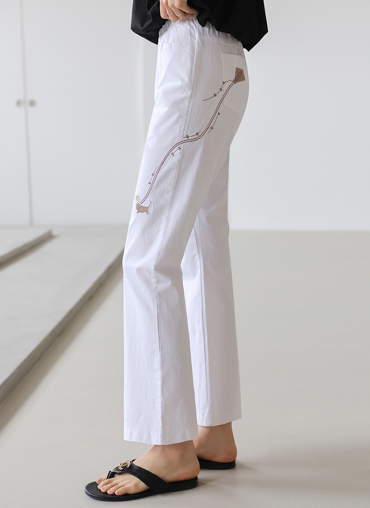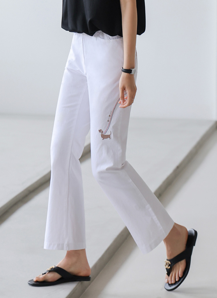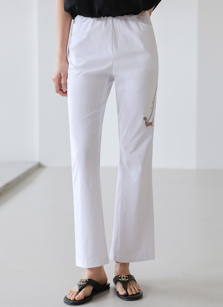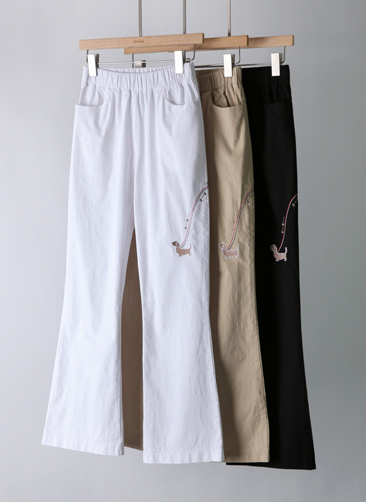 [Whimsical pup detail wraps from back to front on these soft boot-cut pants with a stretch waist for daily comfort.]