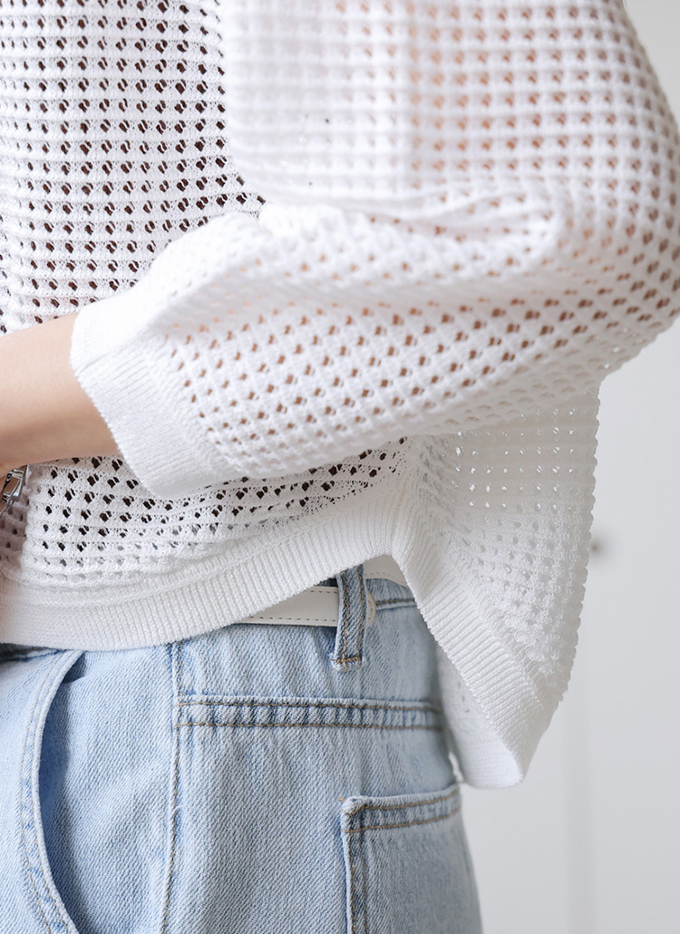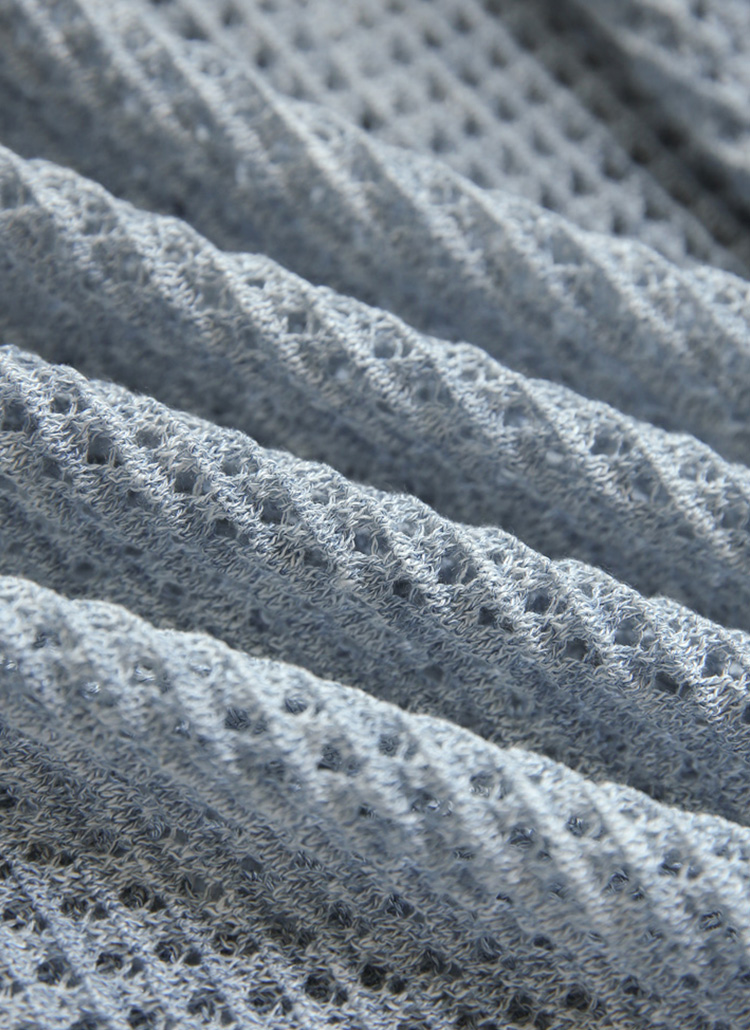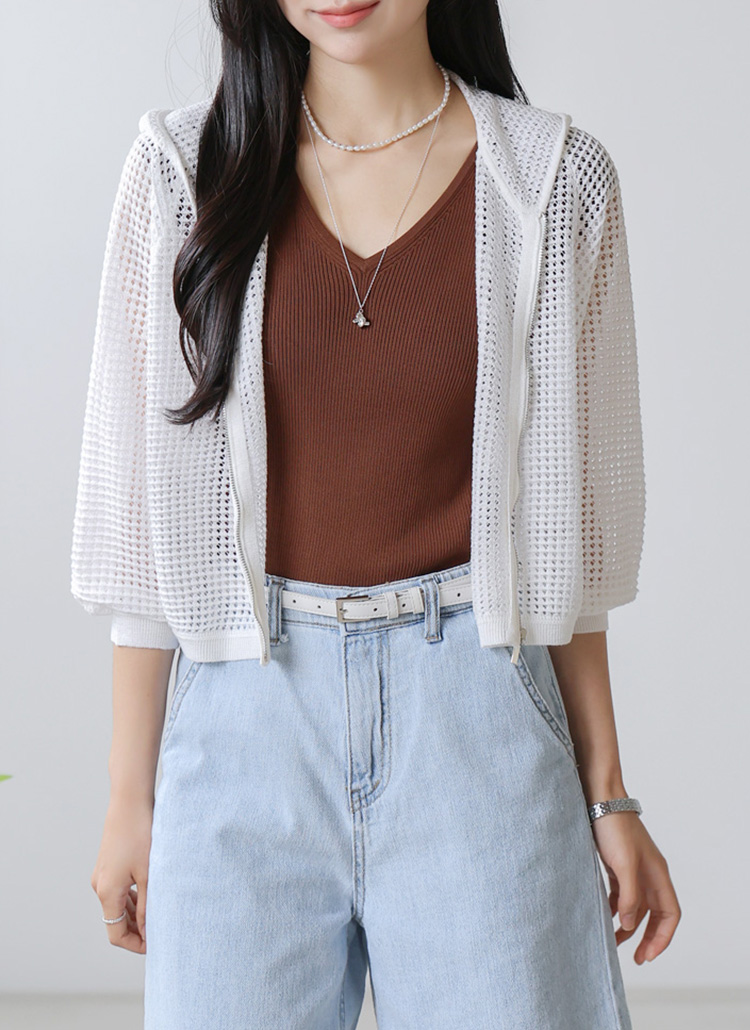 [A breezy 3/4 sleeve knit hoodie with subtle metallic yarn and open waffle texture—cooling and casually refined.]