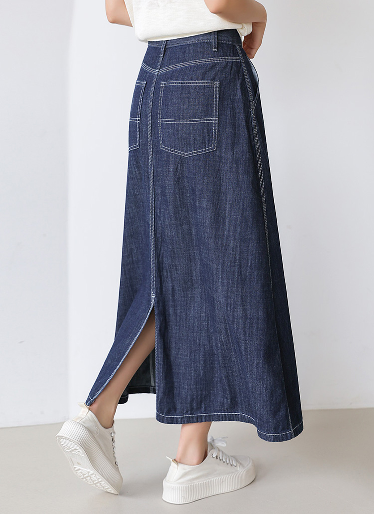 [Lightweight 100% cotton denim skirt with cool white stitch details and a back slit for ease and a stylish feminine shape.]