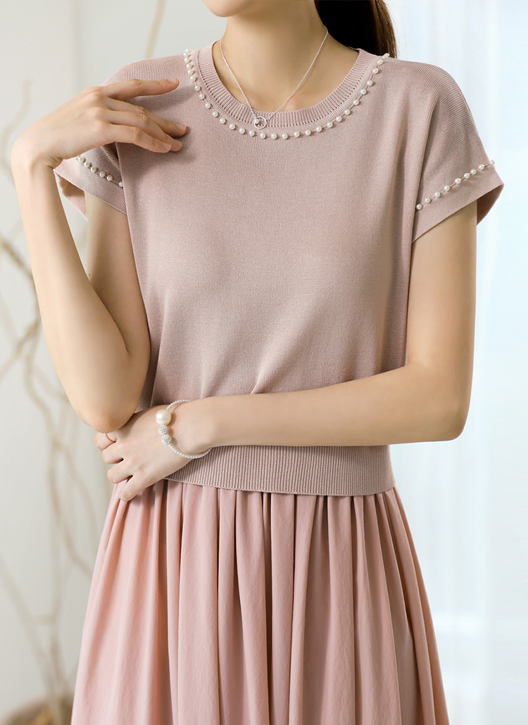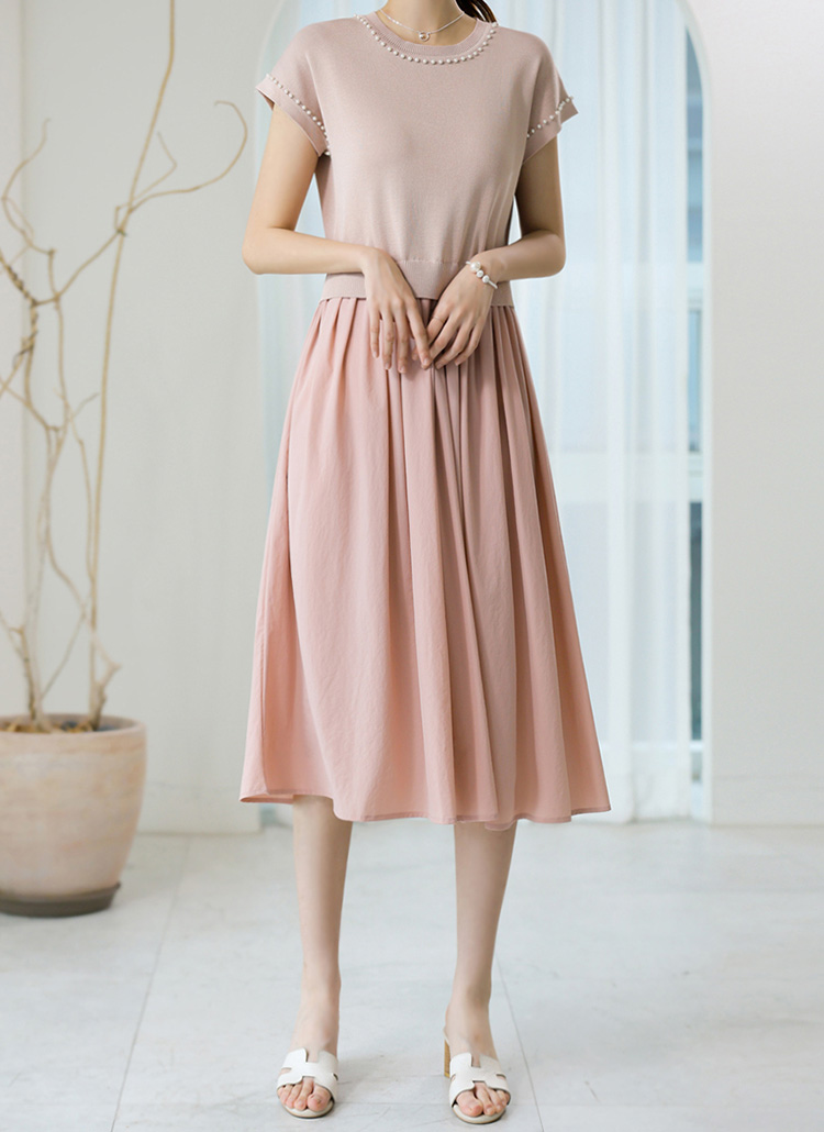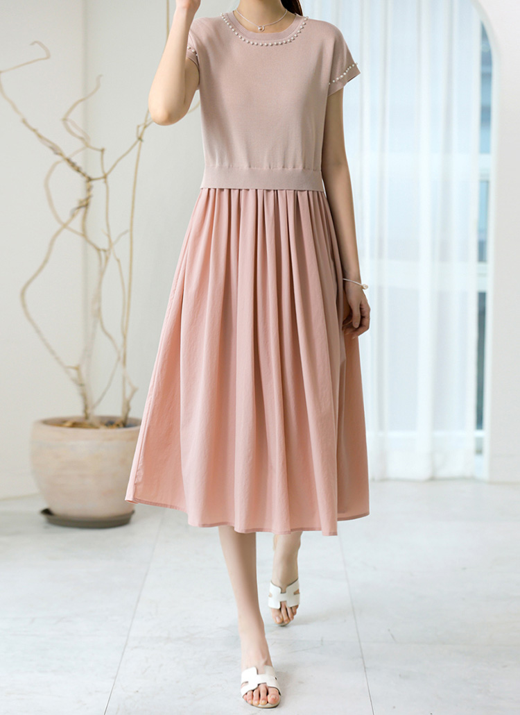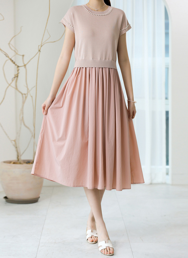 [Pearl accents and a soft knit top meet a breezy cotton-blend flare skirt in this elegant, easy-to-wear summer-ready dress.]