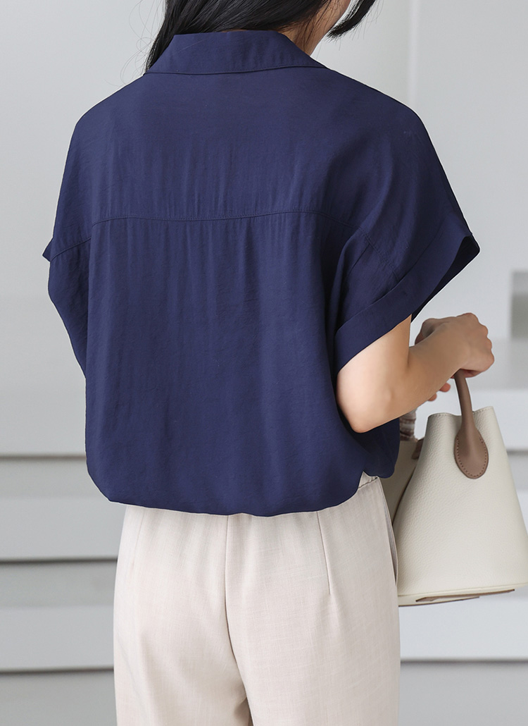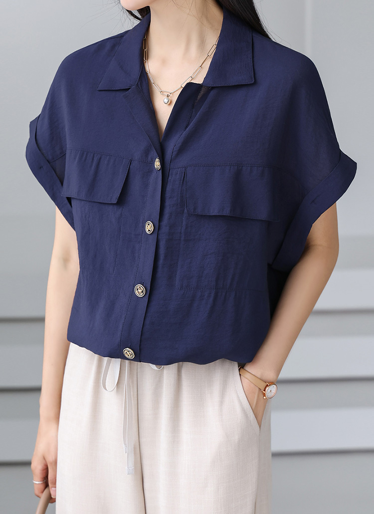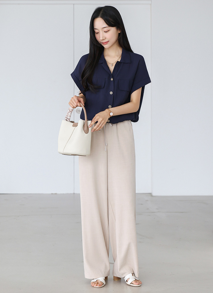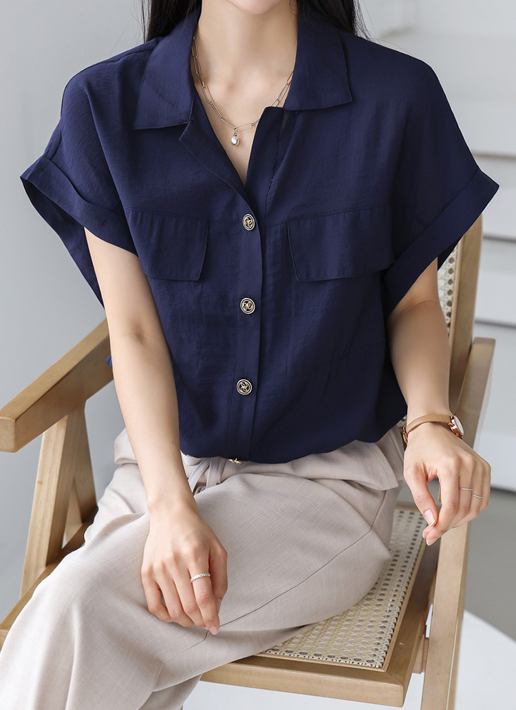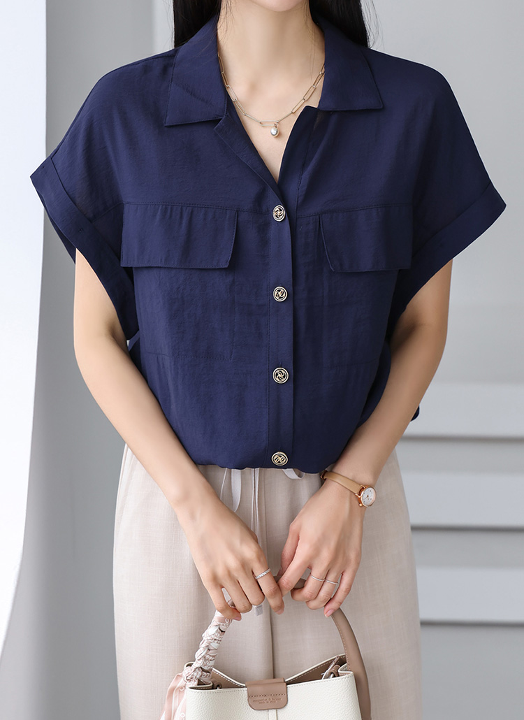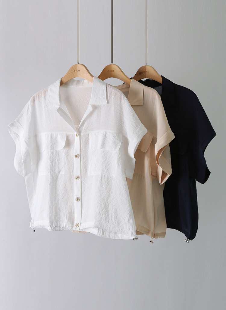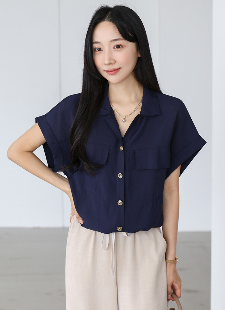 [This open-collar shirt blouse shines with gold buttons and a drawstring hem—sleek, feminine, and perfect for warm-weather looks.]