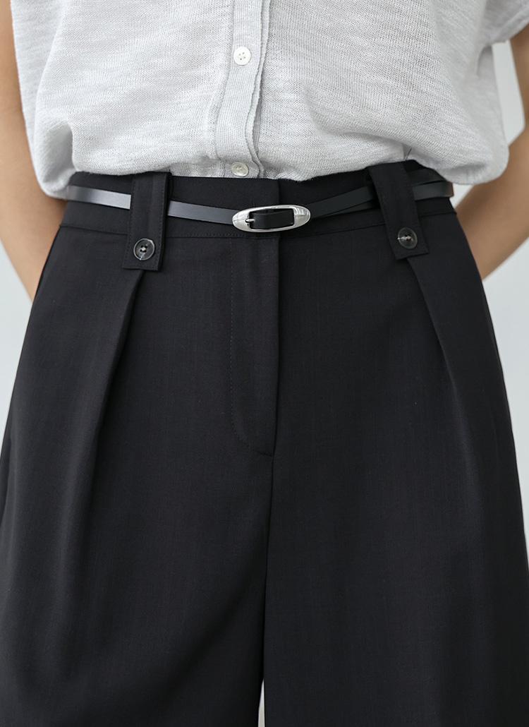 [Featuring sleek pintucks and button-loop detail, these mid-length slacks are perfect for elevated summer styling.]