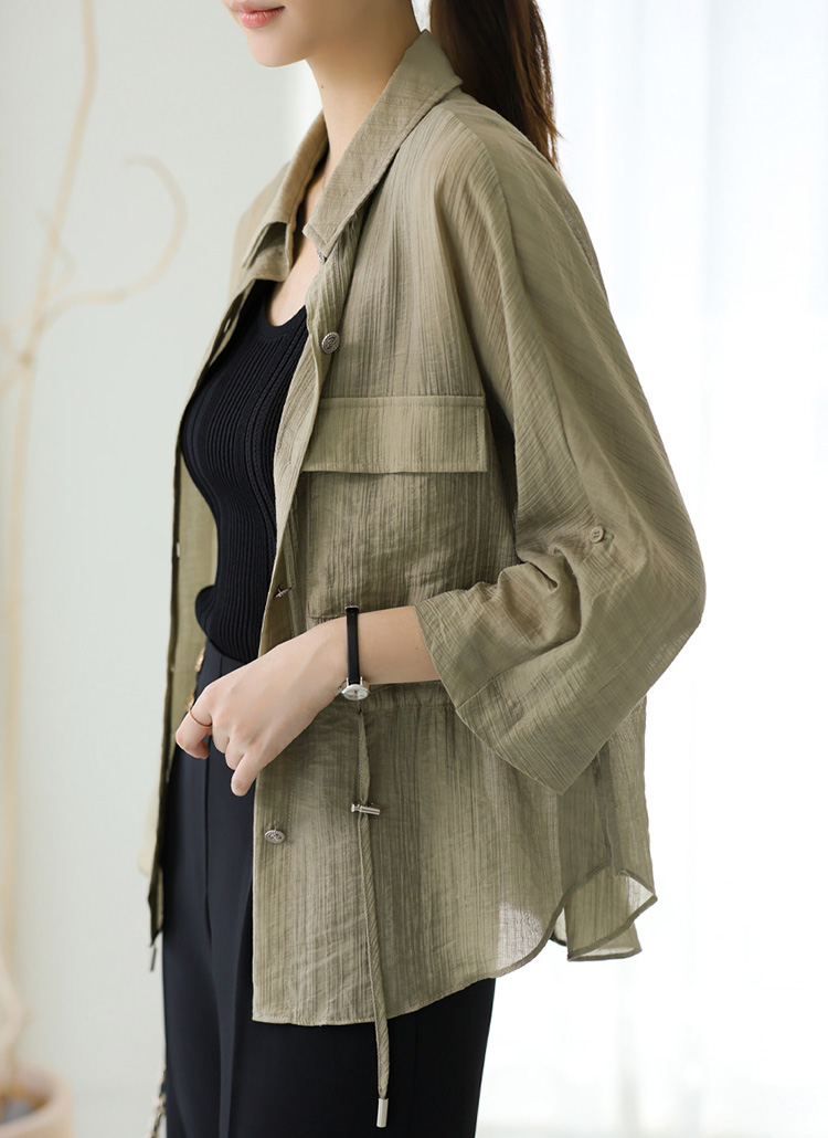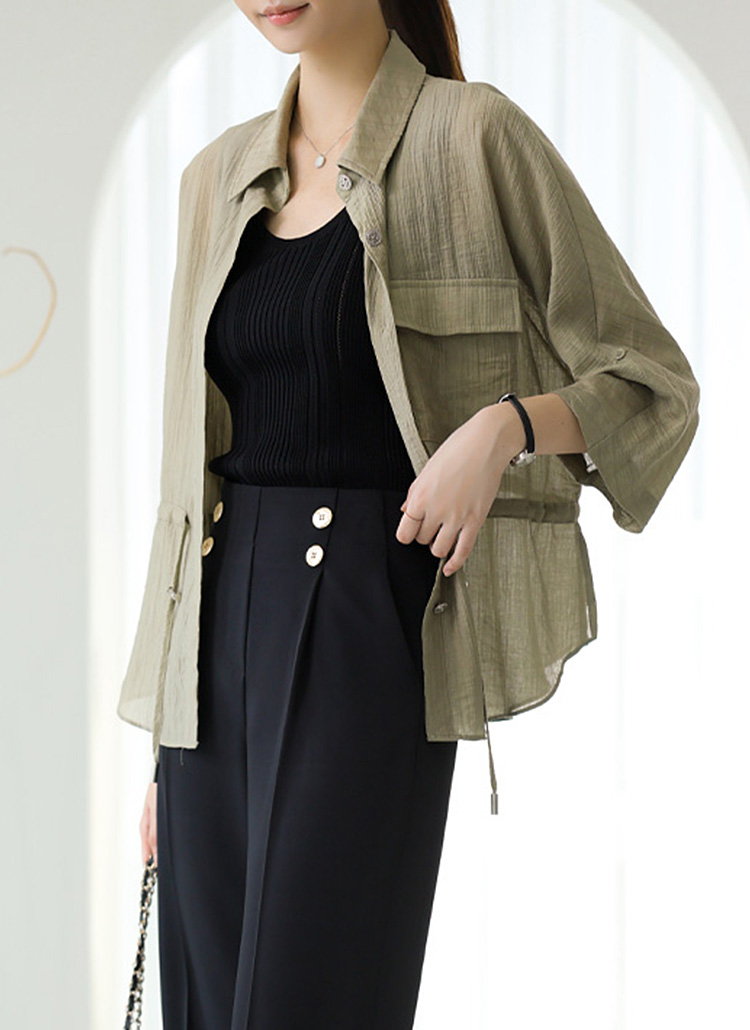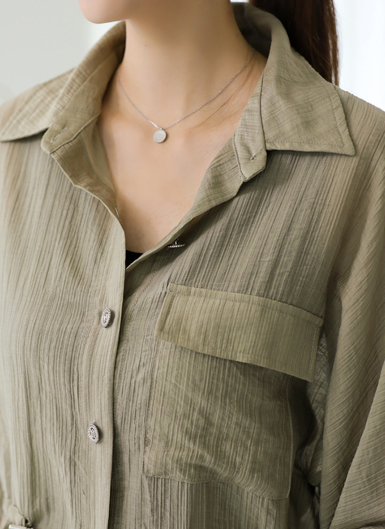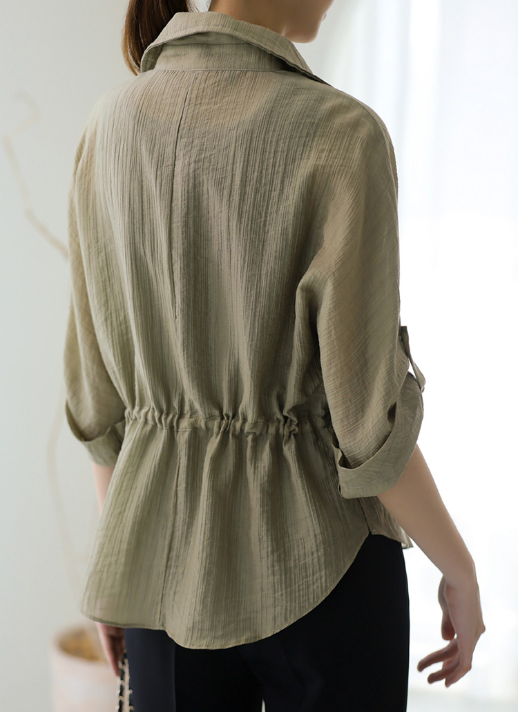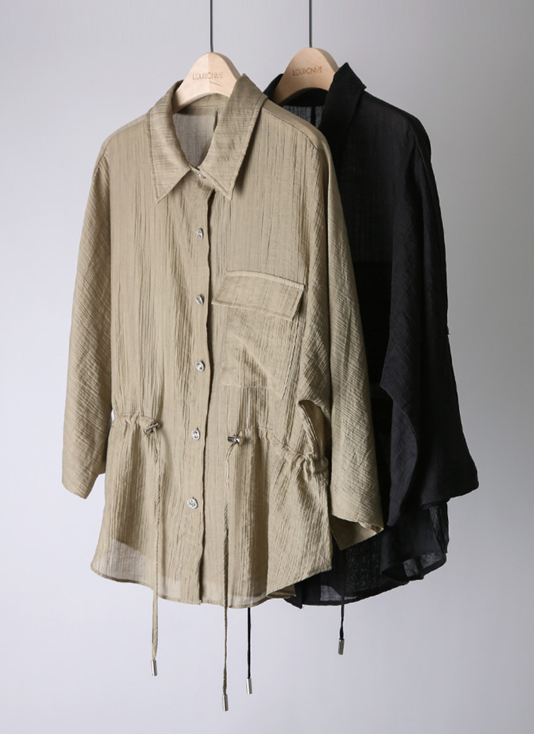 [A lightweight, sheer shirt with a crinkled finish and waist drawstring—wear it open or closed for versatile, breezy style.]