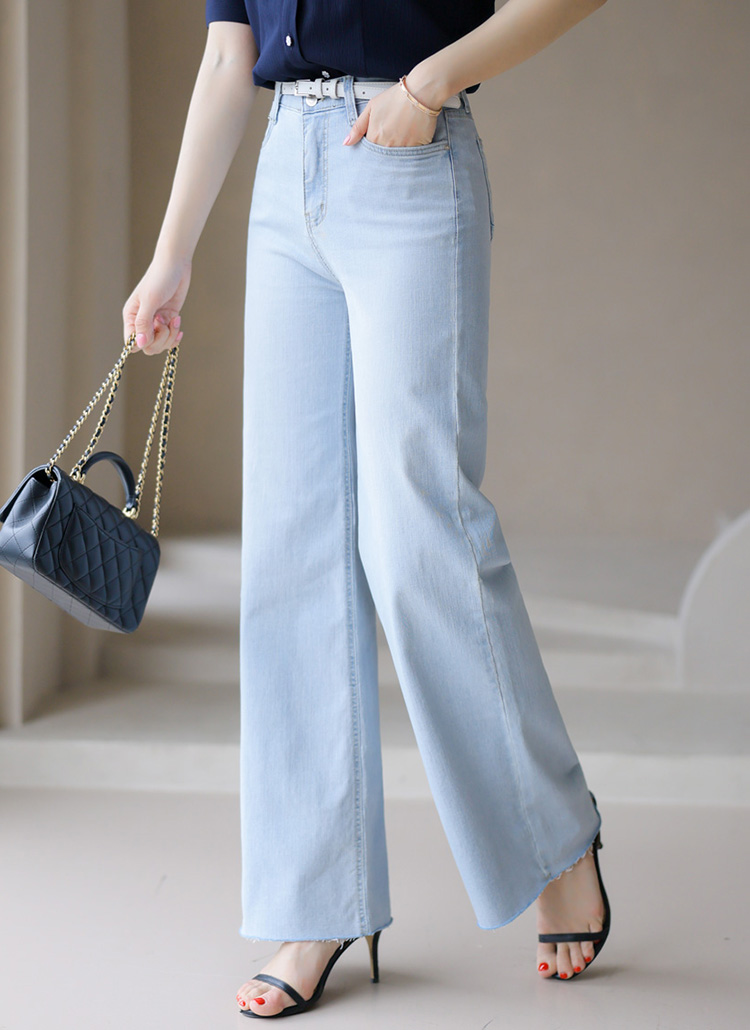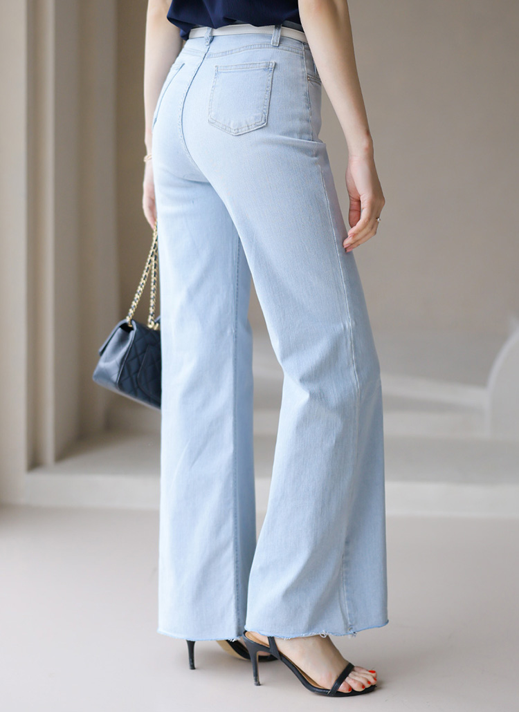 [With a light blue wash, raw hems, and hidden stretch waistband, these wide jeans offer cool comfort and a sleek leg line.]