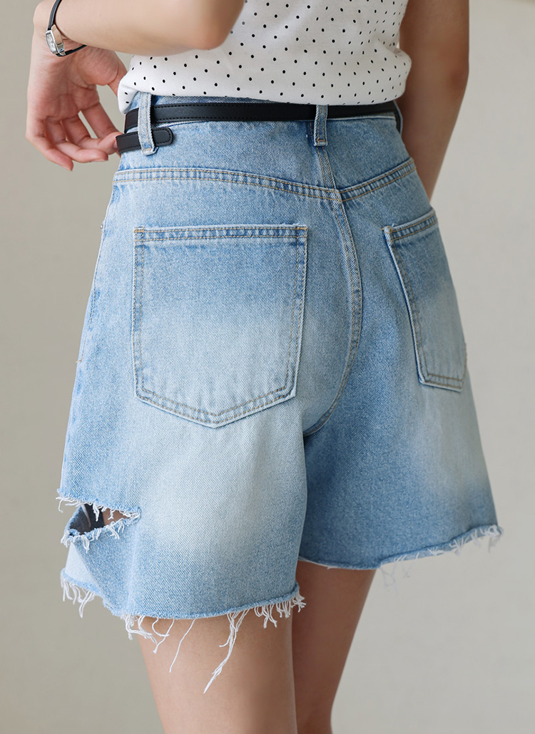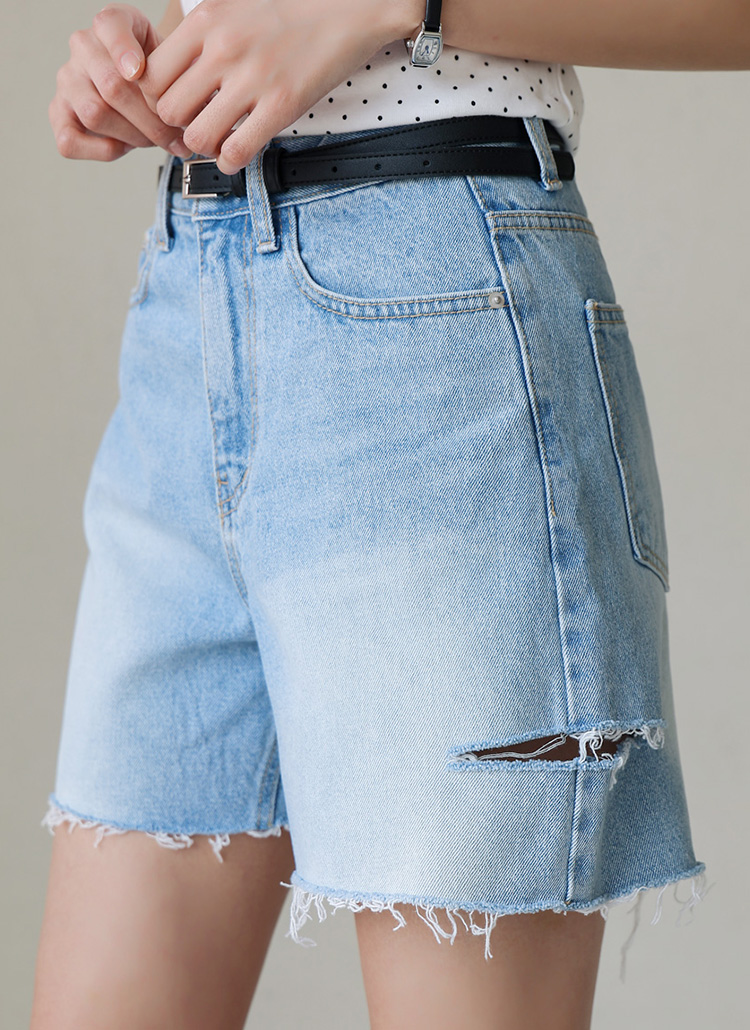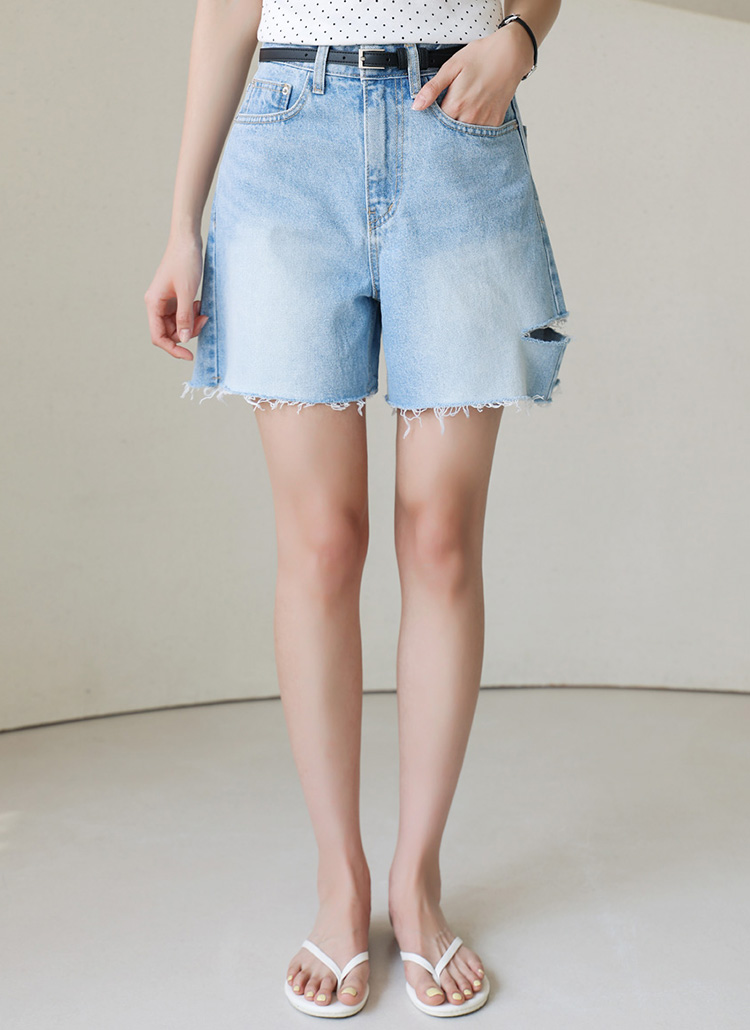 [With distressed slits and raw hems, these 100% cotton denim shorts add a trendy, casual edge to your summer wardrobe.]