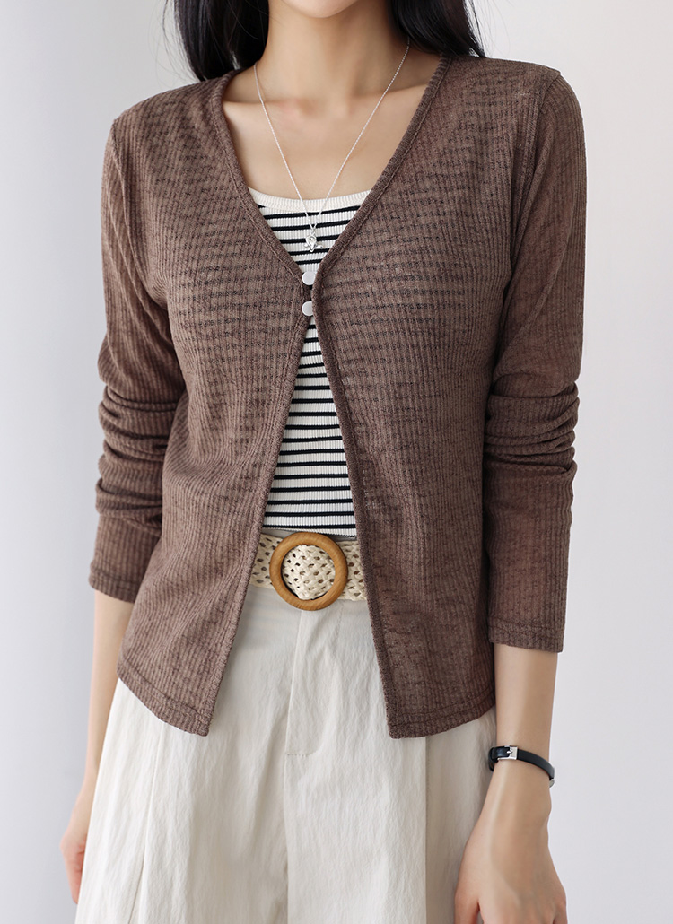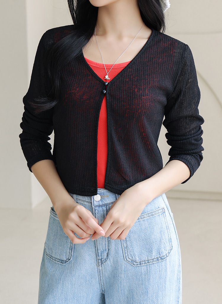 [Ultra-light sheer cardigan in ribbed stretch fabric with top two-button closure—perfect for cool indoor spaces or breezy evenings.]