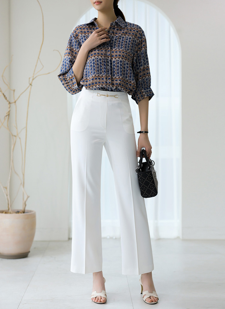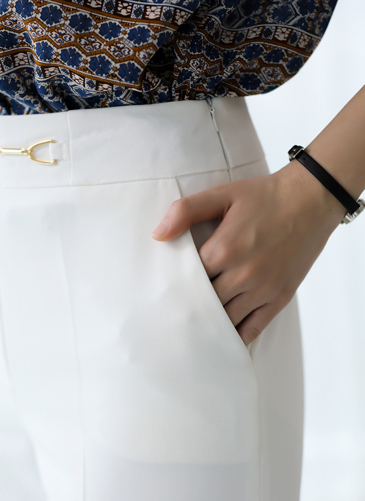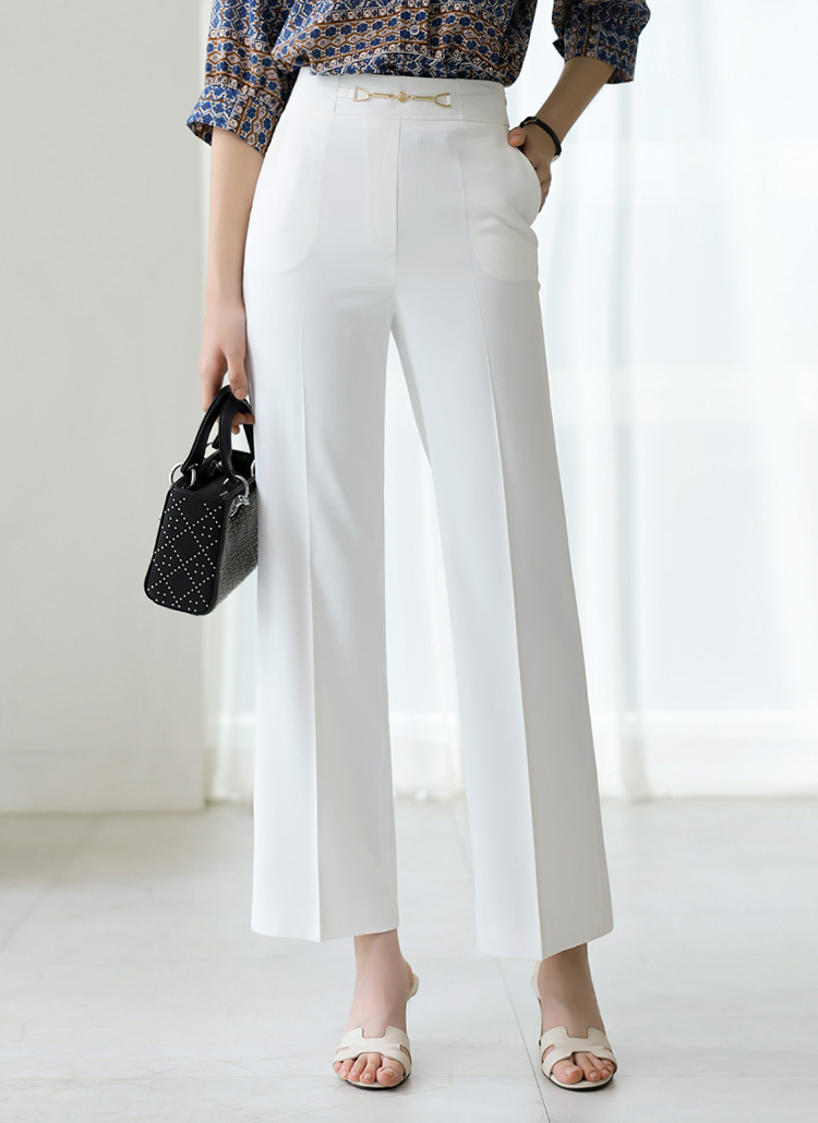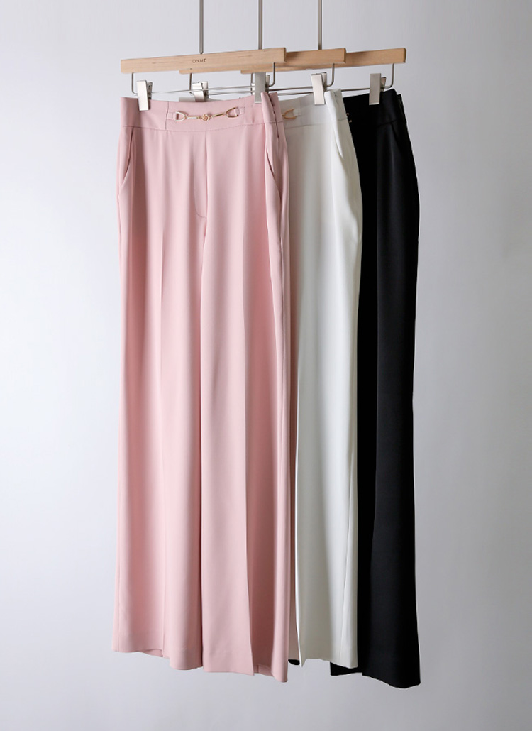 심플한 디자인에 골드 체인 장식을 더해 고급스러움을 한층 업그레이드한 세미 와이드 슬랙스 팬츠에요 :)