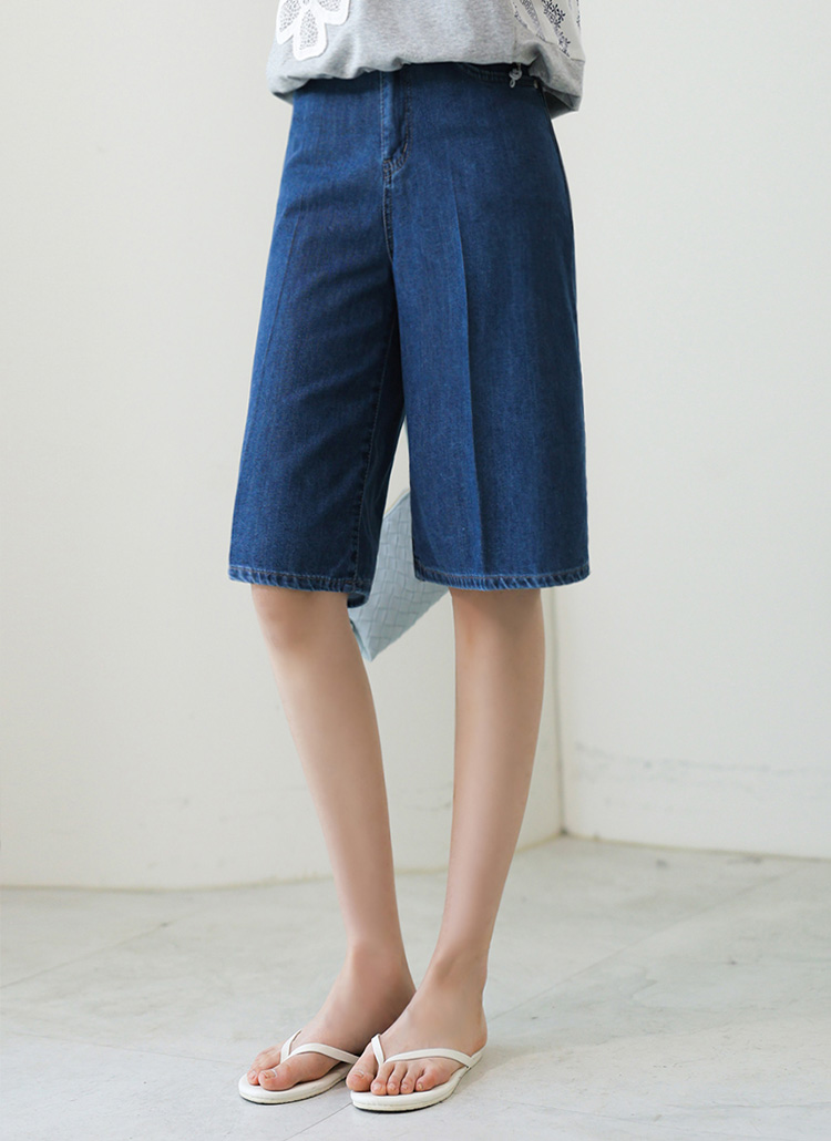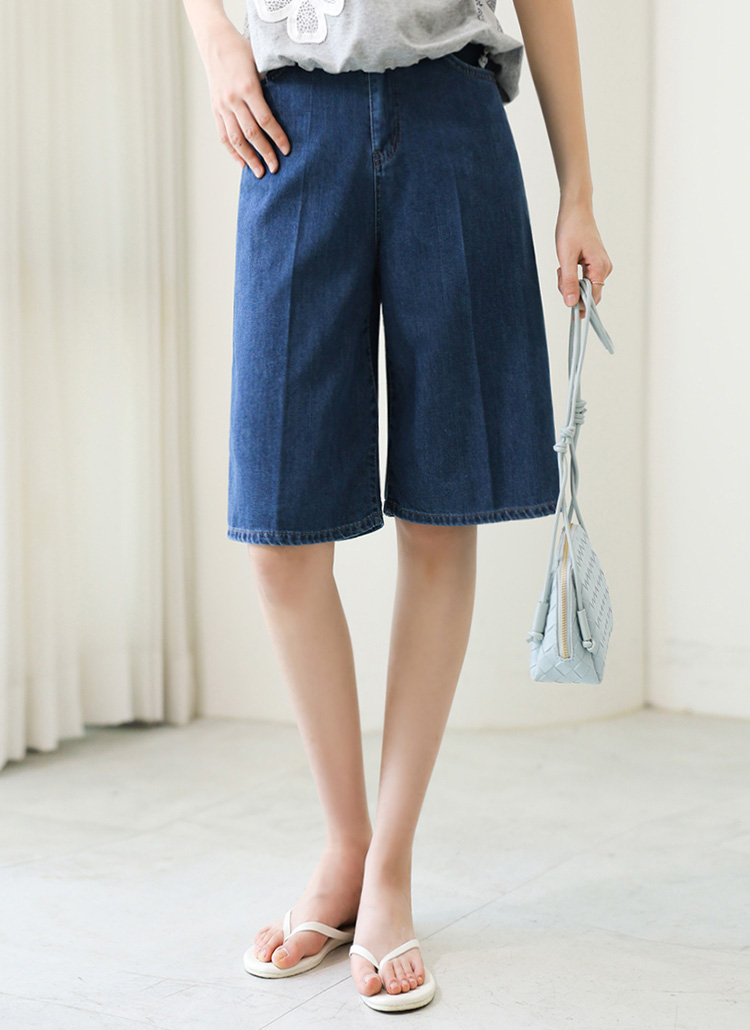 [Made from a soft Cotton-Tencel blend, these semi-wide denim shorts feature a pressed front line and back waistband for a flattering fit.]