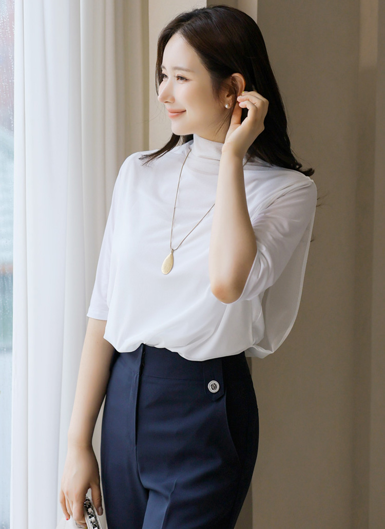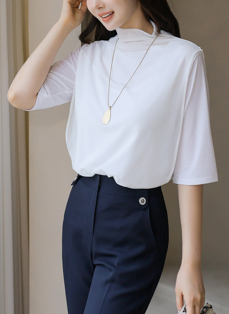 심플하면서 세련된 멋으로 즐기시기 좋은 반하이넥 5부 소매 티셔츠에요 :)