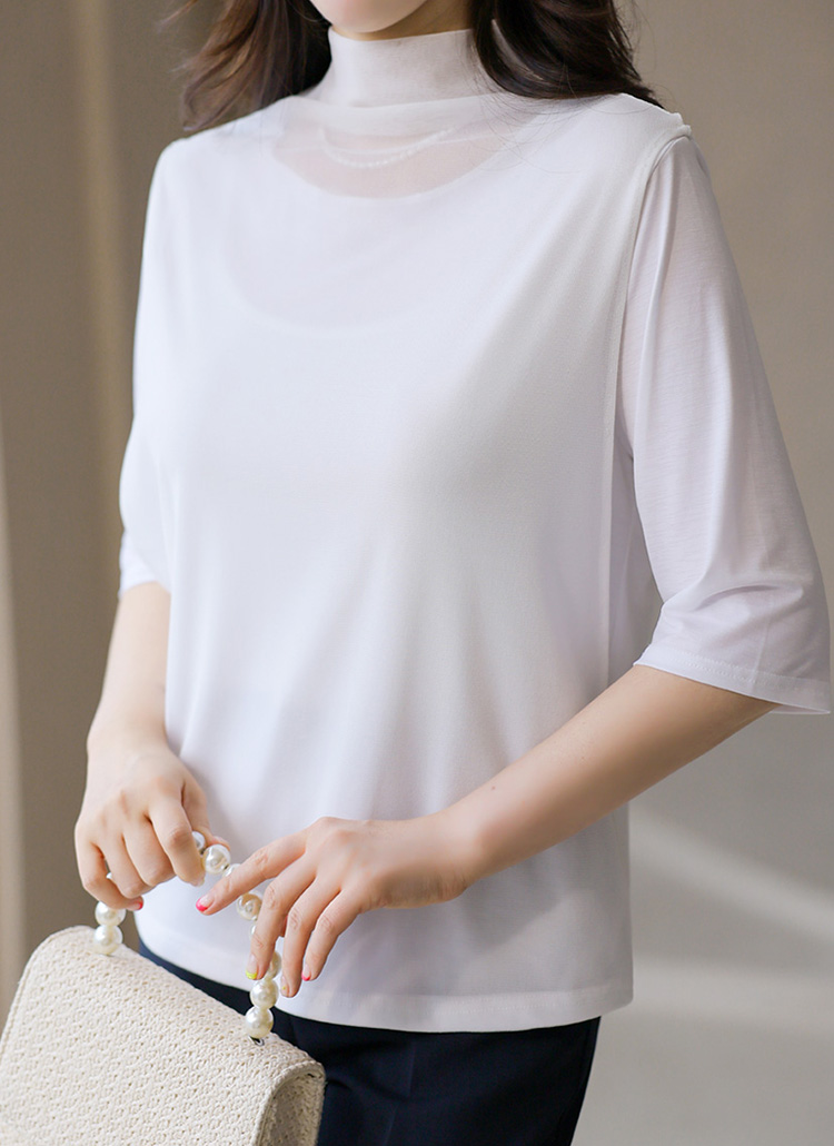 (4 Colors) Soft Stretch Mesh-Layered Mock Neck Tee