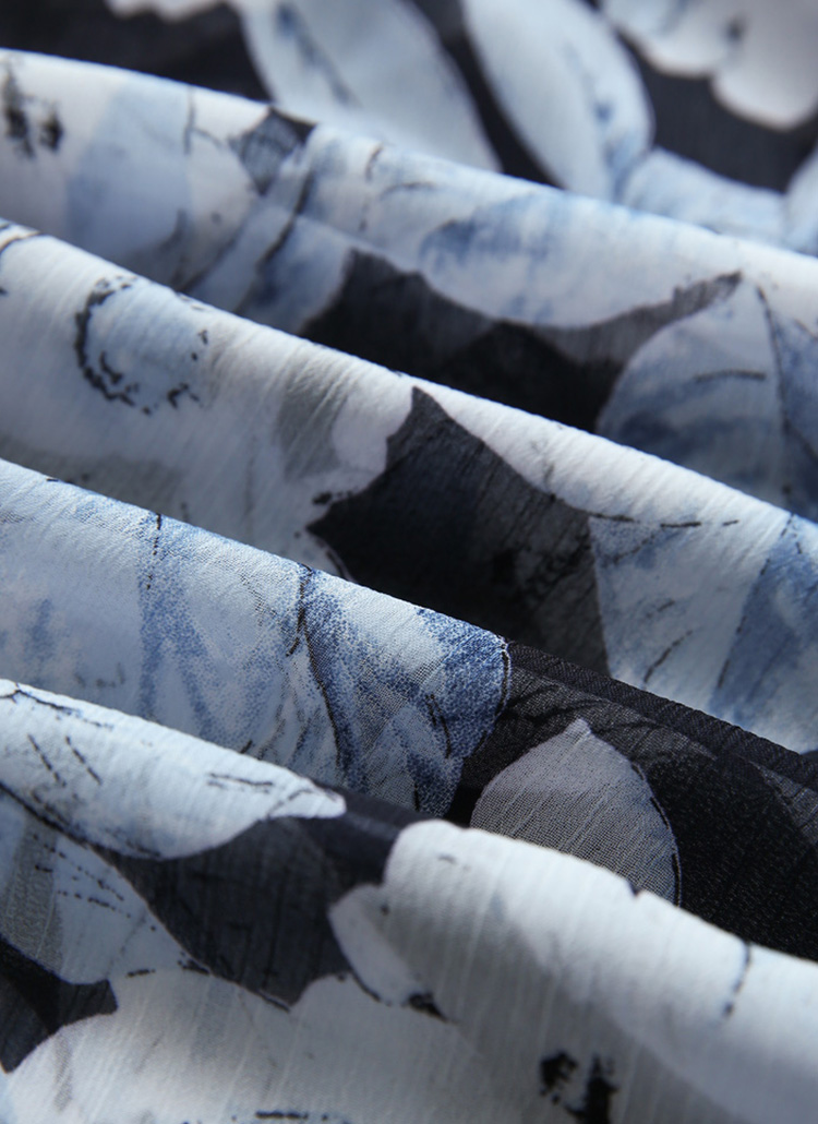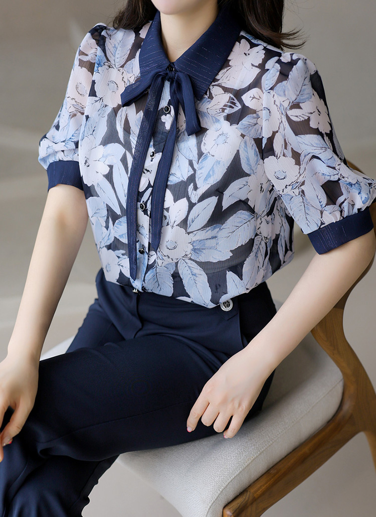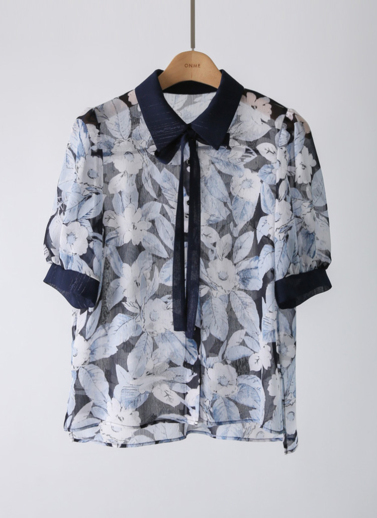 [Sheer chiffon blouse with soft floral print and a hint of shimmer on the collar and tie—lightweight, elegant, and perfect for warm weather.]