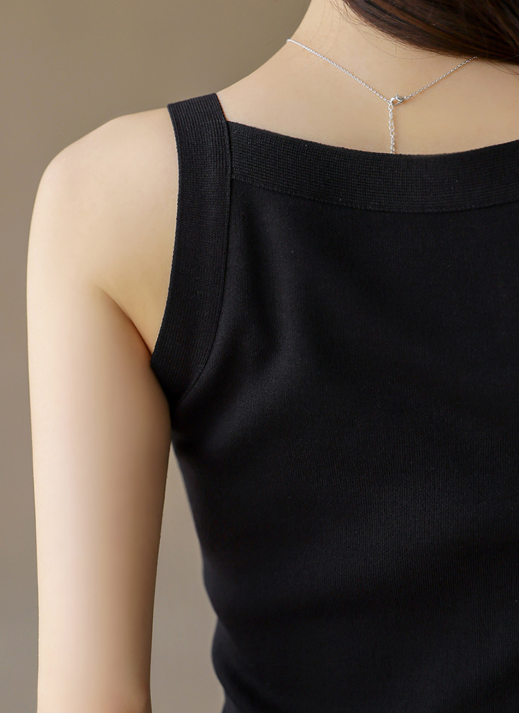 [Lightweight knit tank with a sleek square neckline. Soft rayon blend hugs the body in a clean silhouette. Perfect for layering.]
