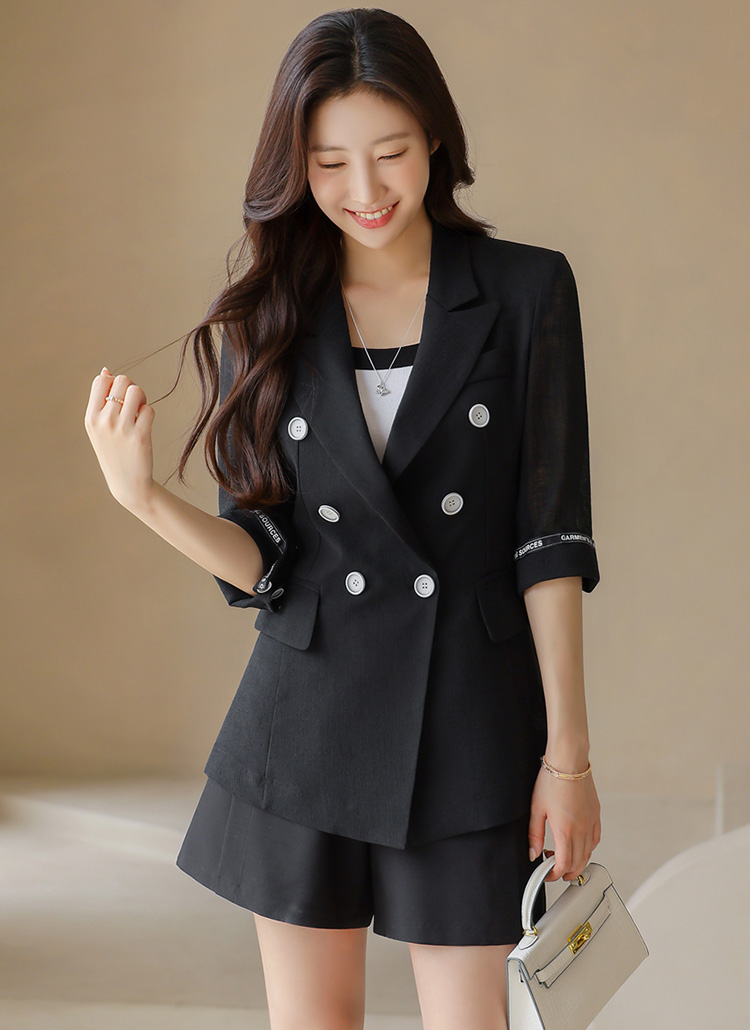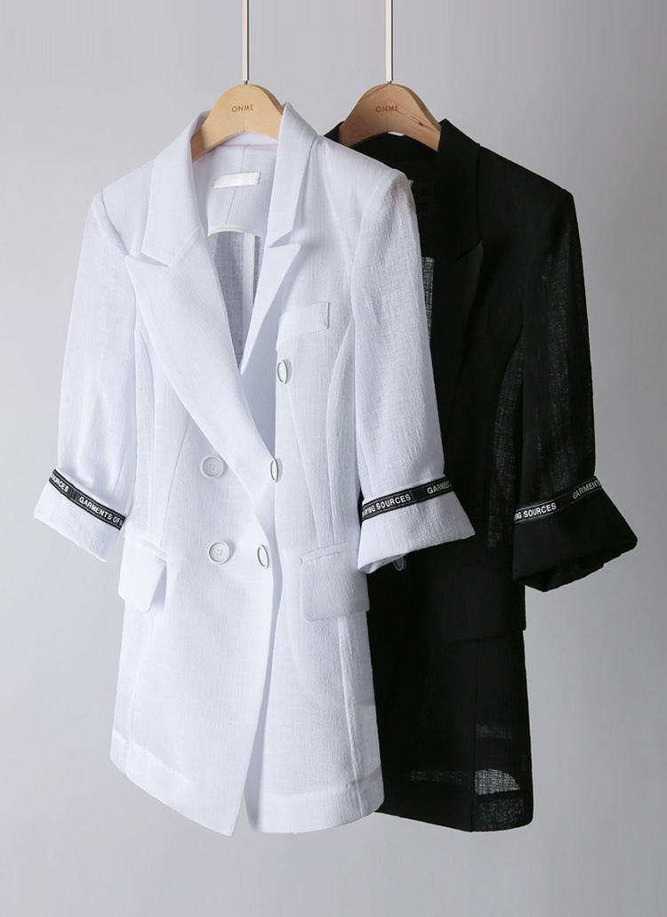 [A modern double-breasted blazer with semi-sheer fabric and stylish lettering revealed when you roll the cuffs. Sleek and versatile.]