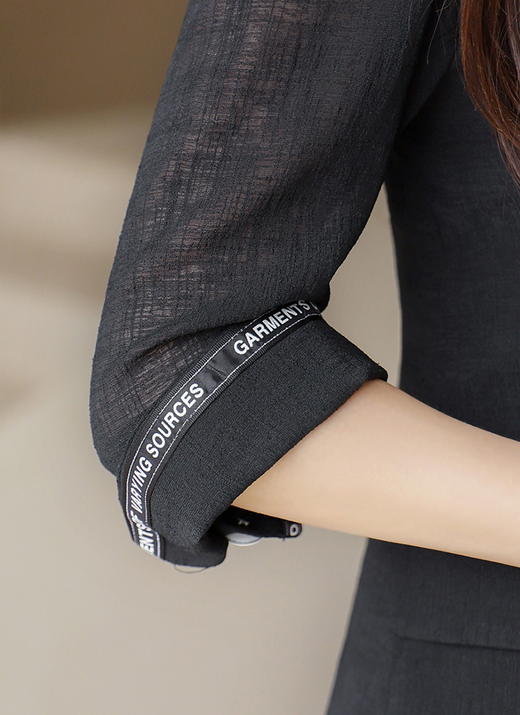 시스루한 원단과 소매에 레터링 테이핑으로 포인트를 준