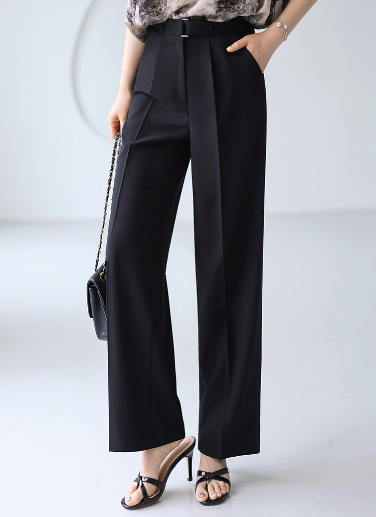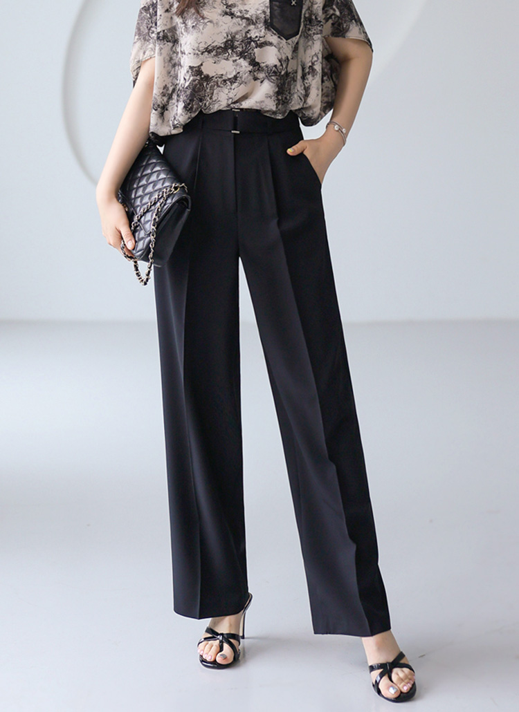 High Waist Stretch Pintuck Wide Slacks w/ Belt