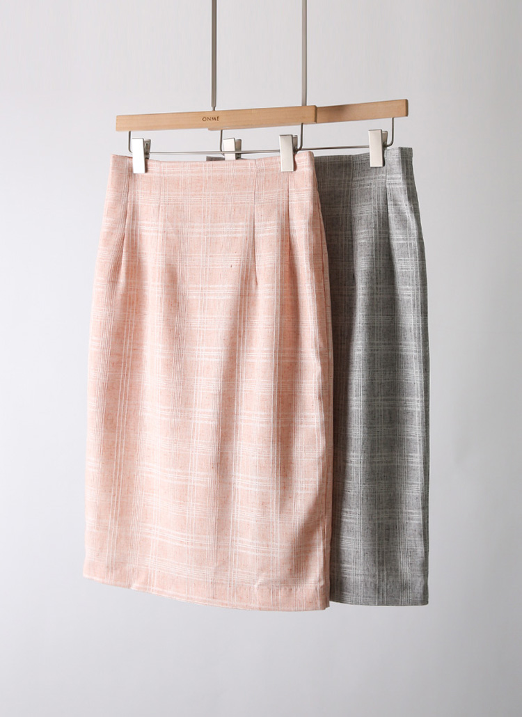 [A clean, feminine silhouette in lightweight check fabric—finished with subtle pleats and a back slit for graceful steps.]