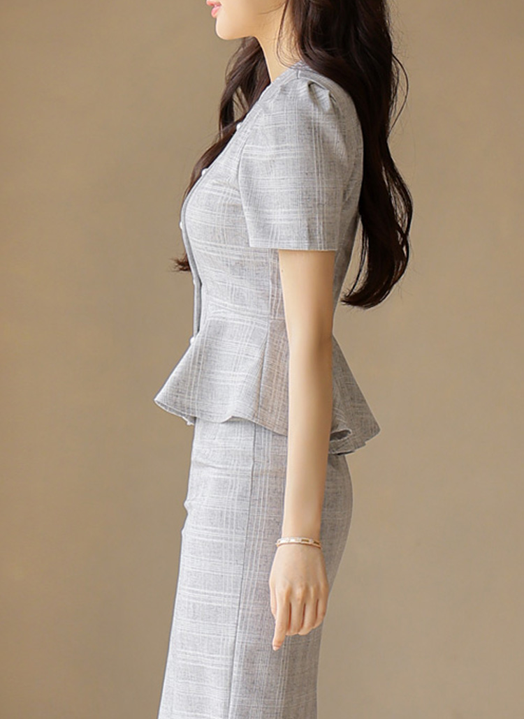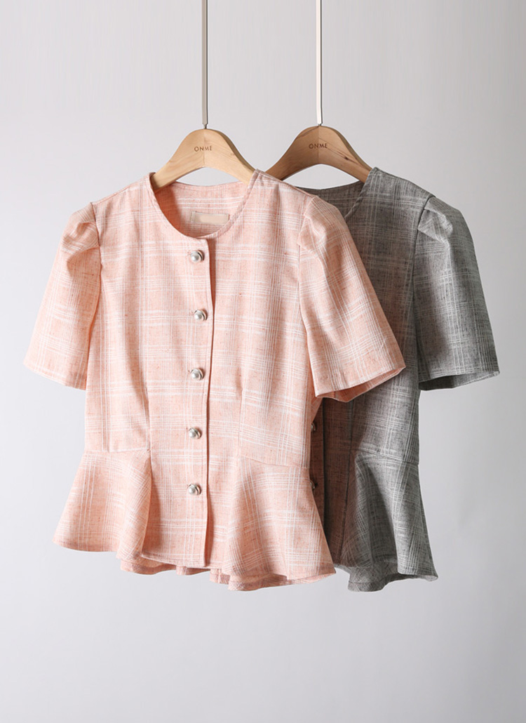 [Feminine puff sleeves and pearl buttons meet a flattering peplum waist in this lightweight summer check jacket.]