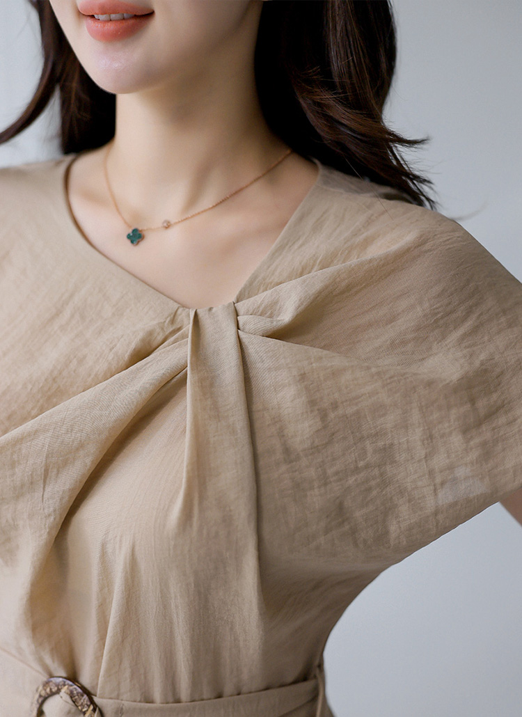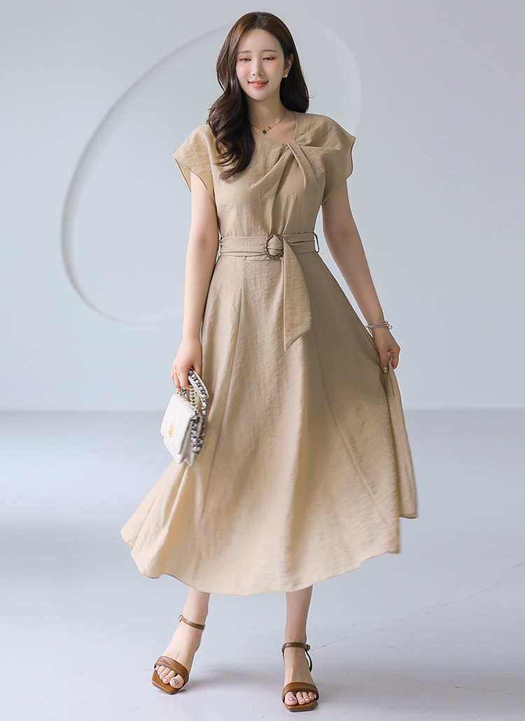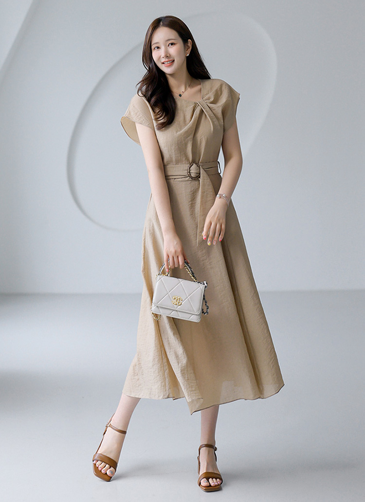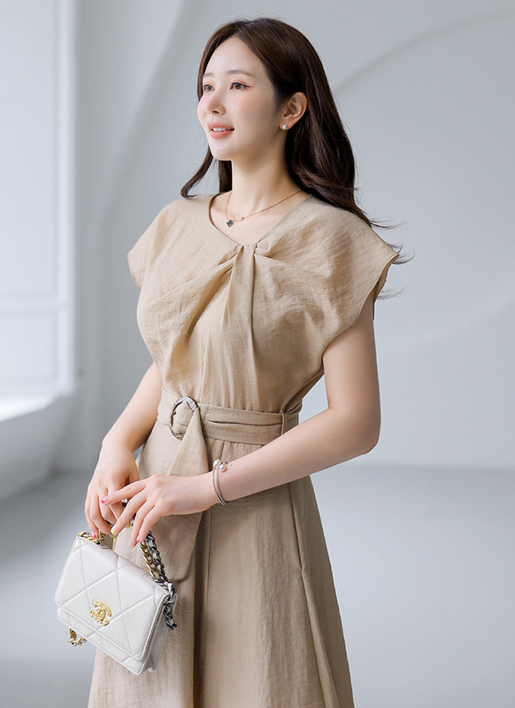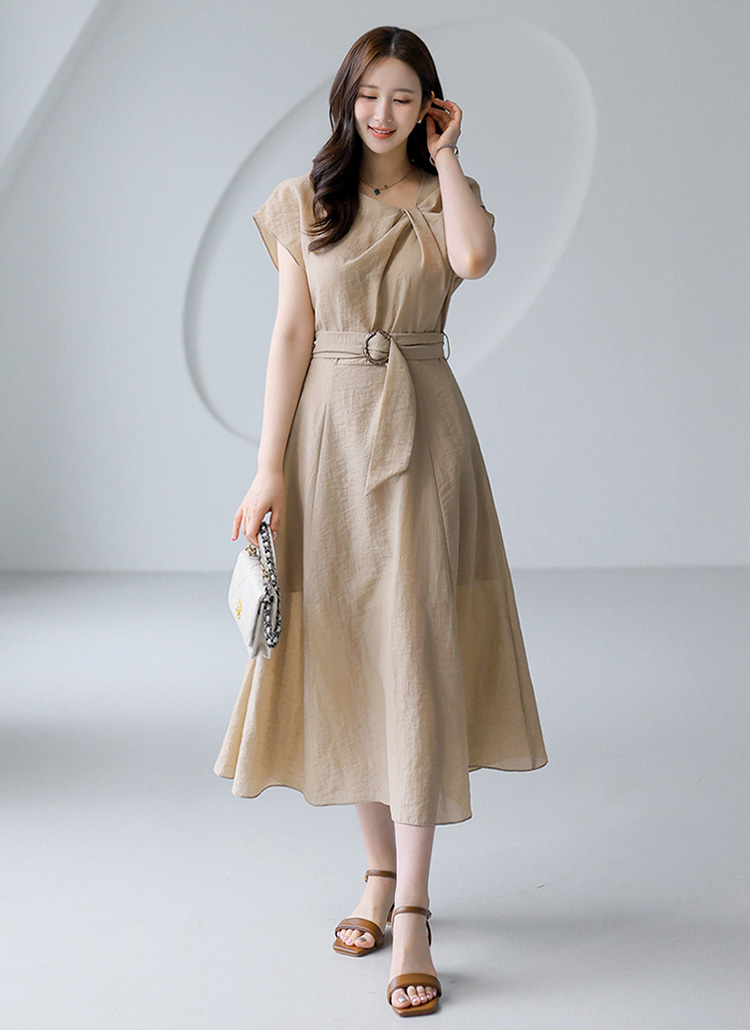 [This sophisticated flare dress combines comfort and style with its twisted neckline and cinched waist belt. The lightweight fabric and graceful A-line cut offer timeless feminine appeal.]
