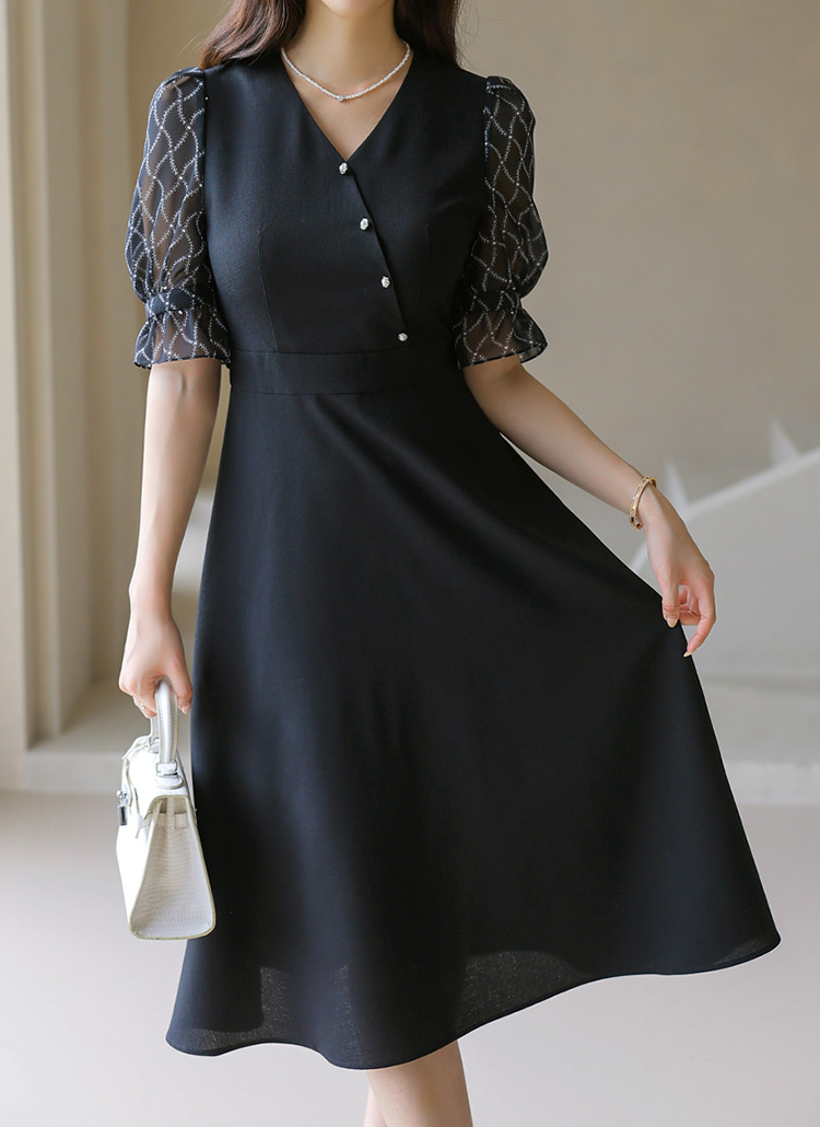 [Romantic puff chiffon sleeves meet a wrap-style bodice with pearl buttons and waist sash—elegance made easy.]