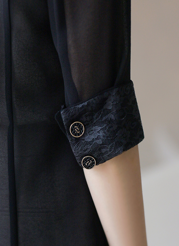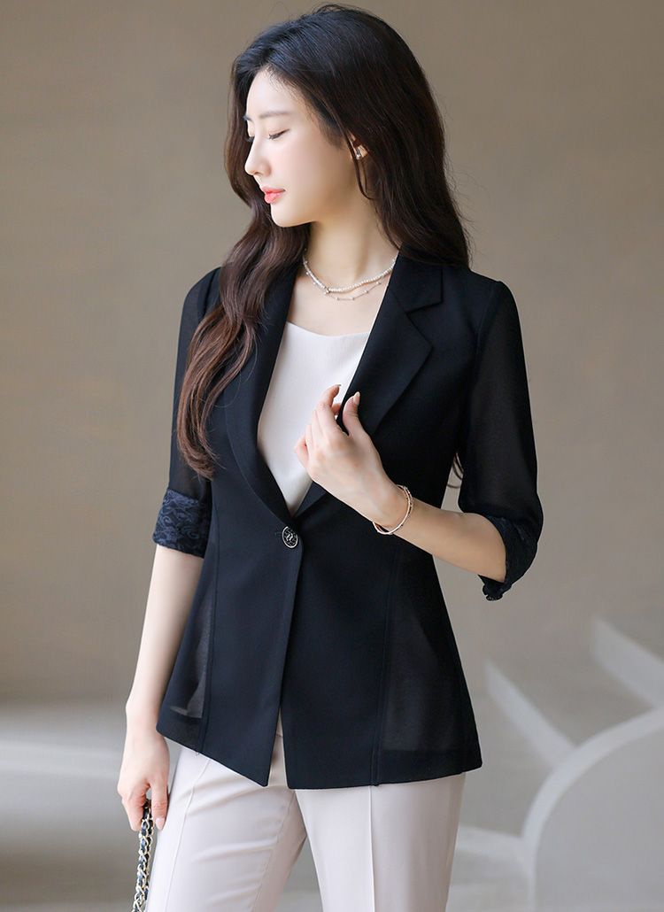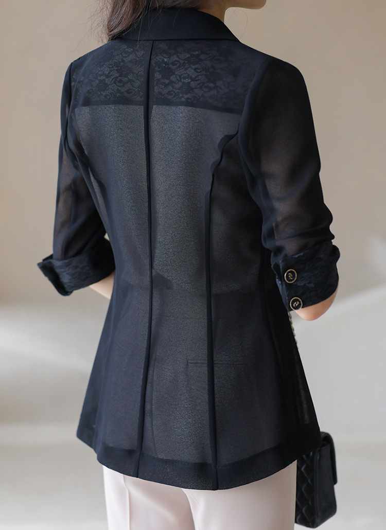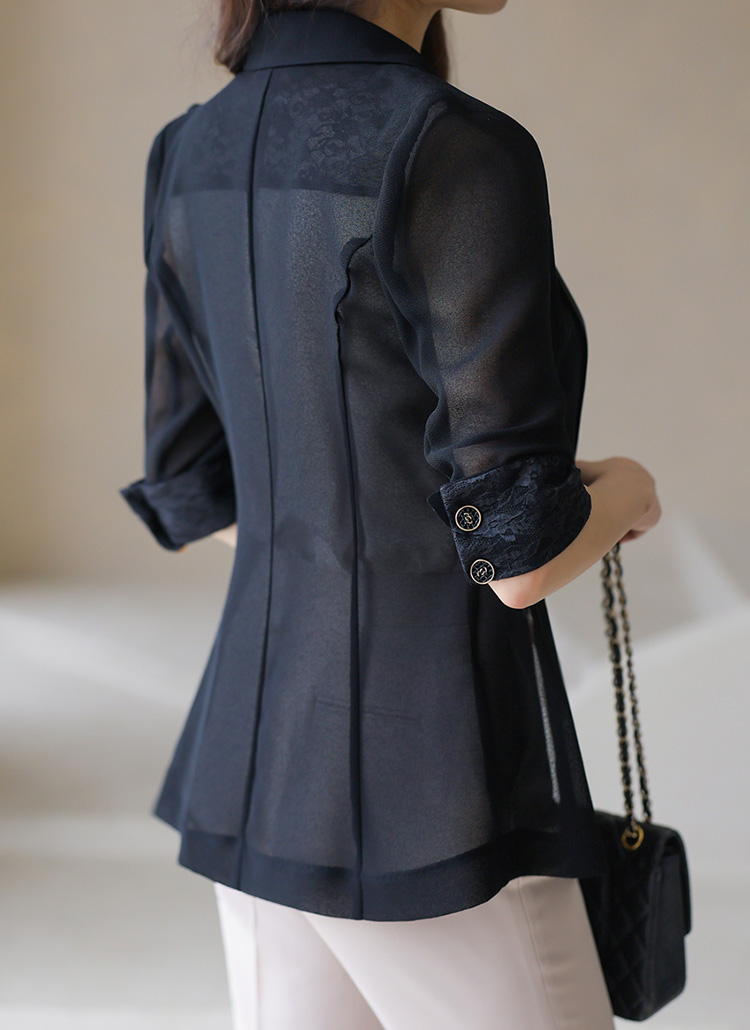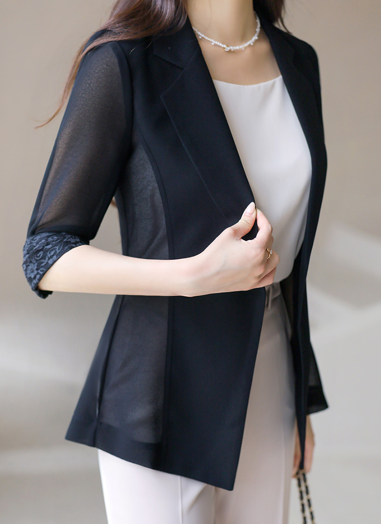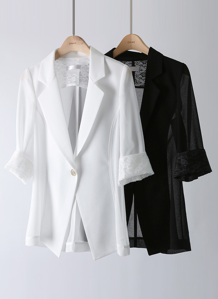 레이스 롤업 소매가 돋보이는 시스루 슬림 자켓으로
